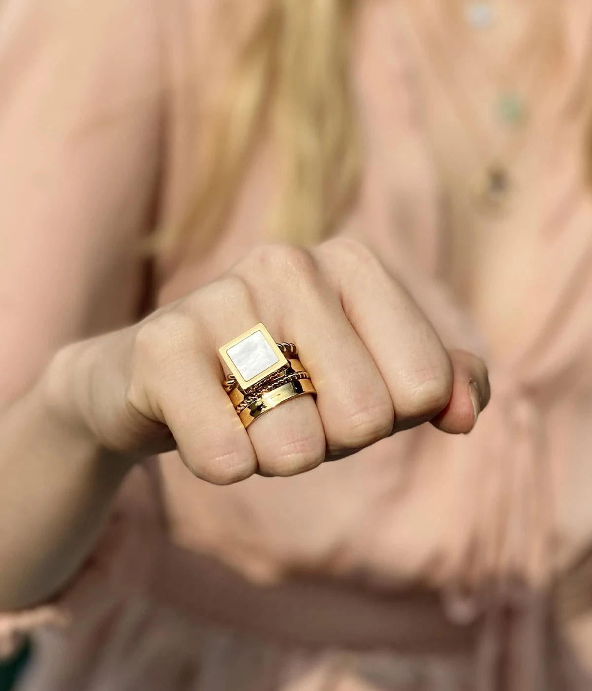 Bague large ajustable en acier dorĂ© Ă lâor fin.