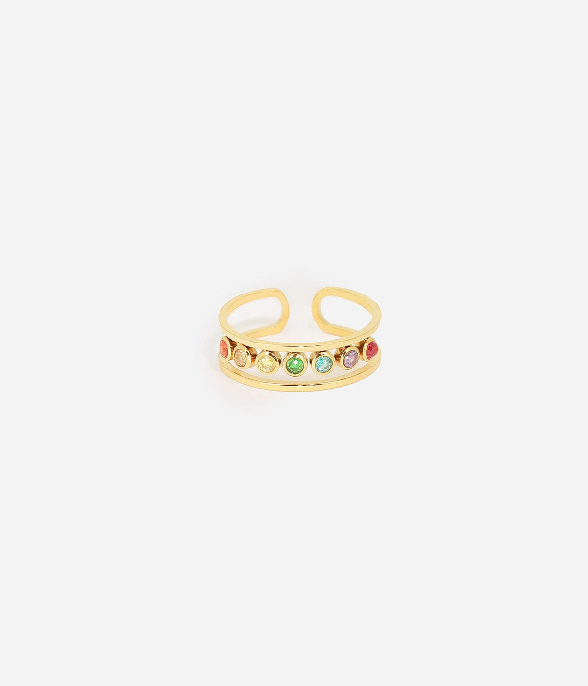 Bague en acier dorĂ© Ă l’or fin sur laquelle se trouve les couleurs des 7 chakras : racine, sacrĂ©, plexus solaire, cĆur, gorge, 3Ăšme Ćil et couronne.