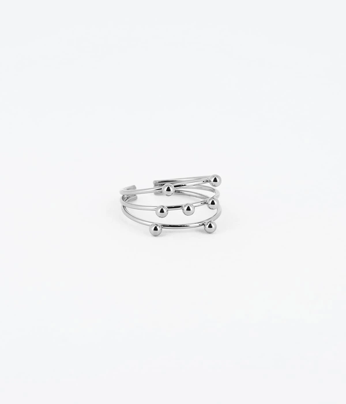 Bague ajustable en acier dorĂ© Ă l’or fin, formĂ©e de trois anneaux distincts parsemĂ©s de boules en acier .