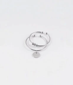 Double bague rĂ©glable en acier uni ou dorĂ© Ă l’or fin. Le premier anneau est agrĂ©mentĂ© d’une mĂ©daille montĂ©e en pampille et le second de petites boules.