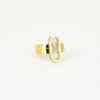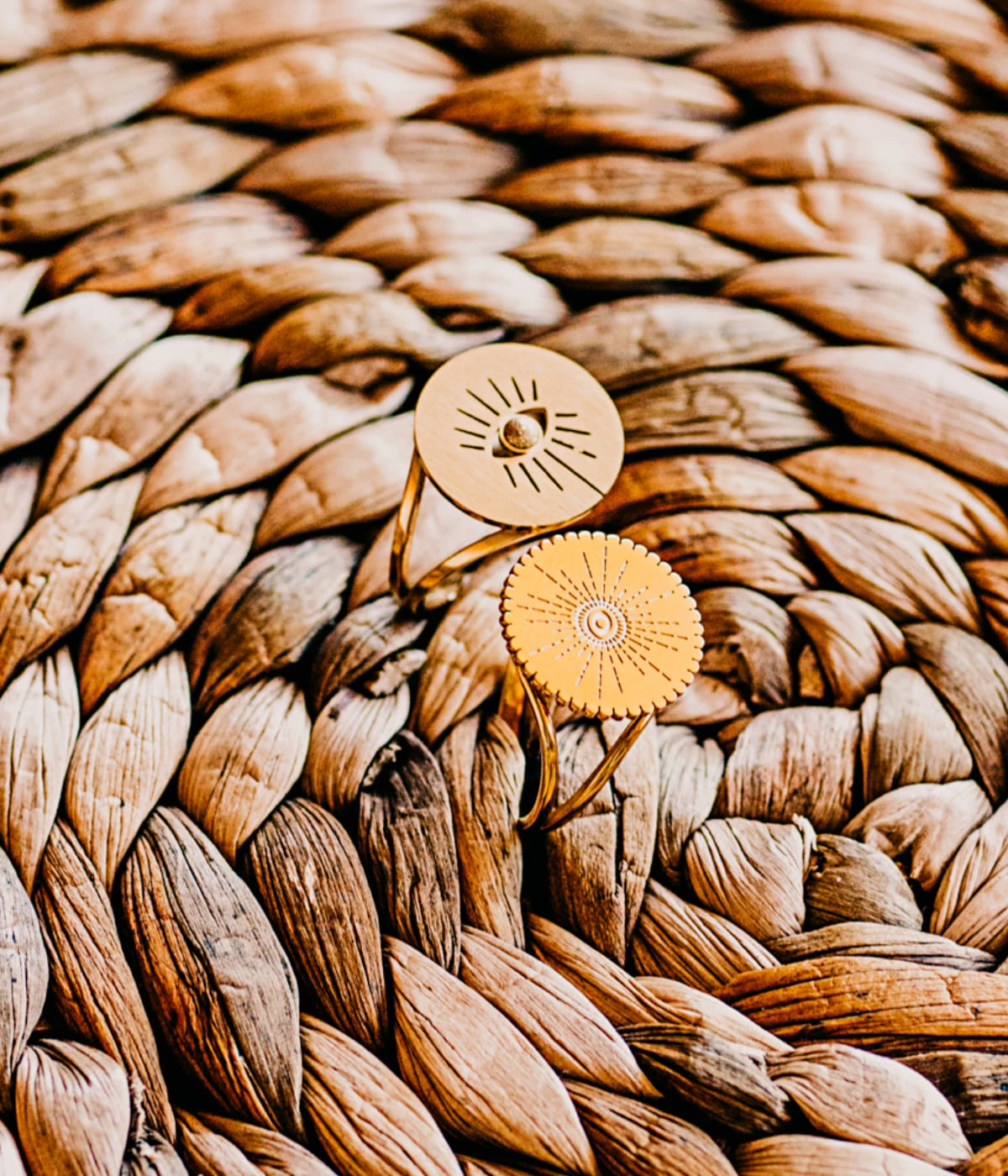 Bague ajustable en acier uni ou dorĂ© Ă l’or fin. Le dessus de la bague est formĂ© d’une pastille de mĂ©tal gravĂ©e.