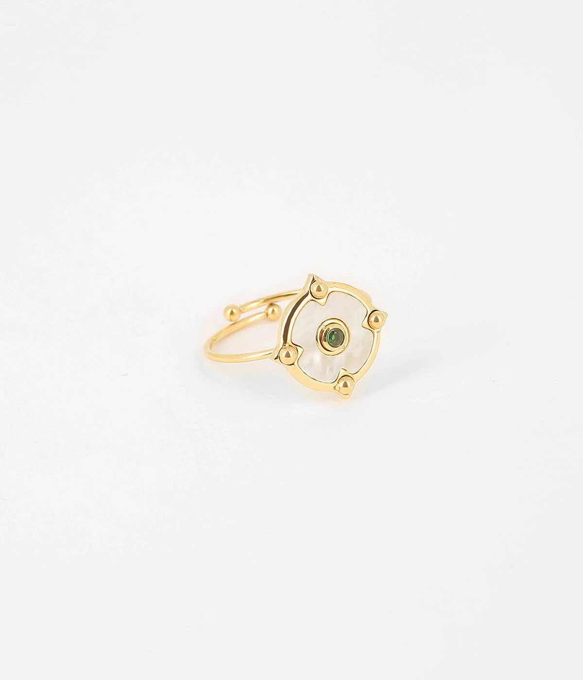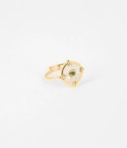 Bague ajustable en acier dorĂ© Ă l’or fin sur laquelle une pastille colorĂ©e est attachĂ©e.