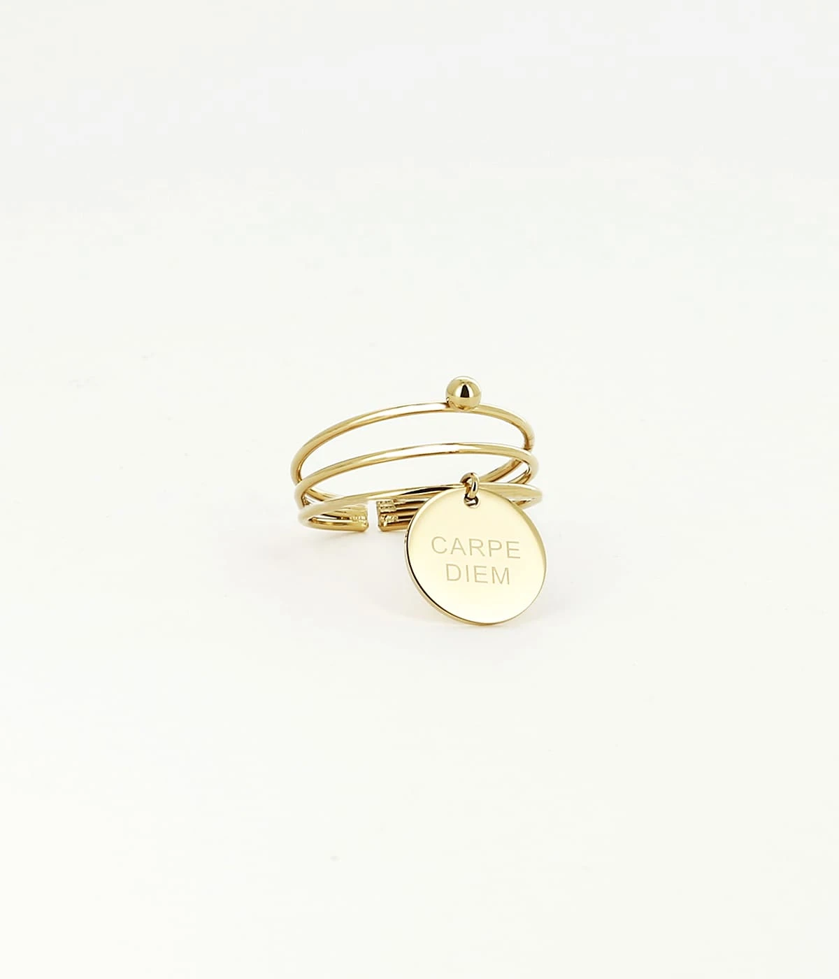 Cette bague est formée de 3 rangs avec le message « Carpe Diem » gravé sur un médaillon.