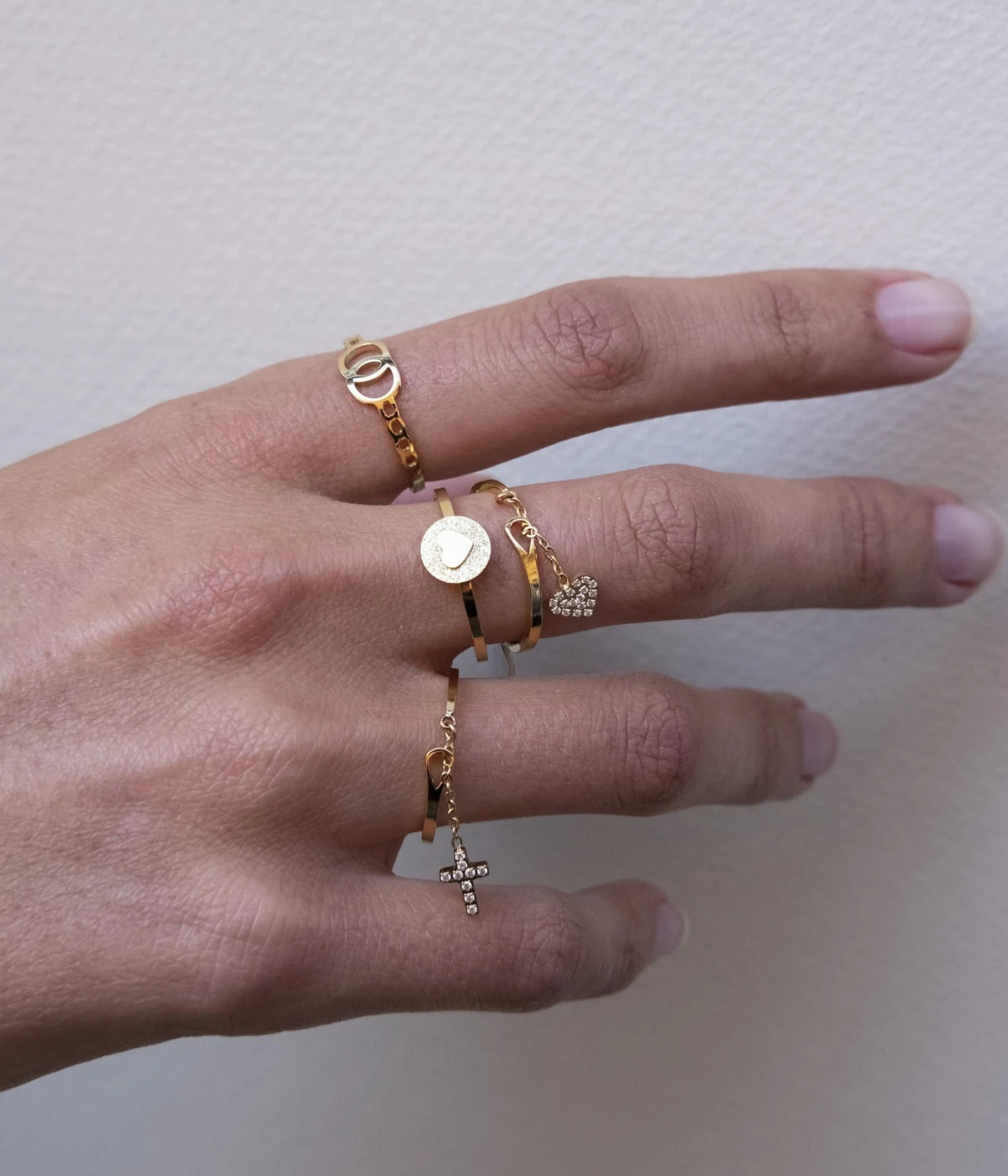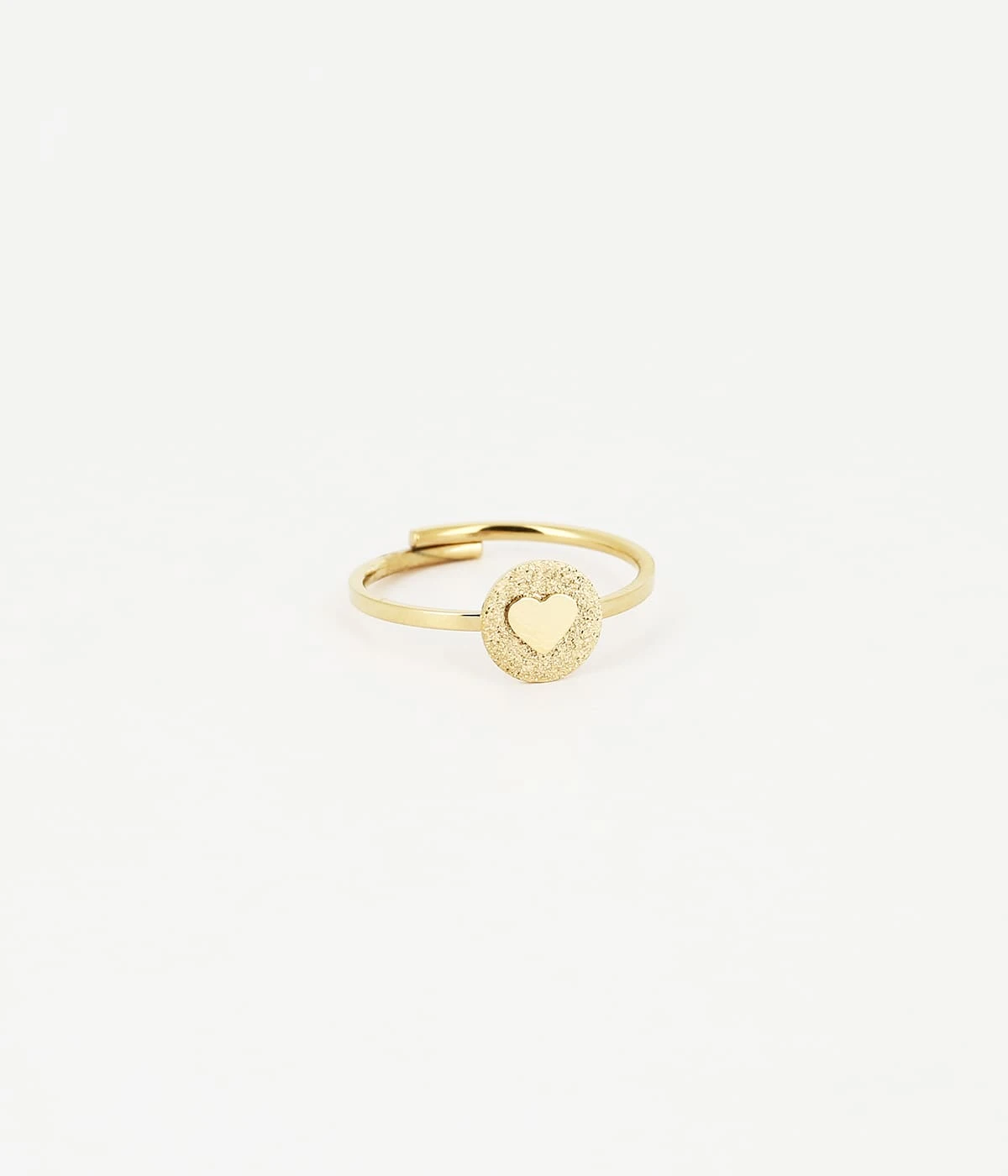 Bague ajustable en acier doré à l’or fin sur laquelle une médaille estampillée d’un motif en cœur est sertie.