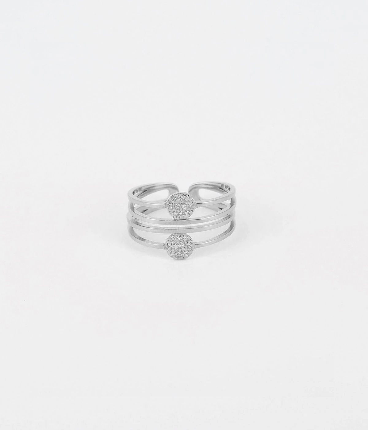 Bague ajustable en acier uni ou dorĂ© Ă l’or fin formĂ©e de plusieurs anneaux rĂ©unis ensemble par deux motifs de zirconiums sertis.