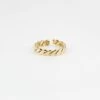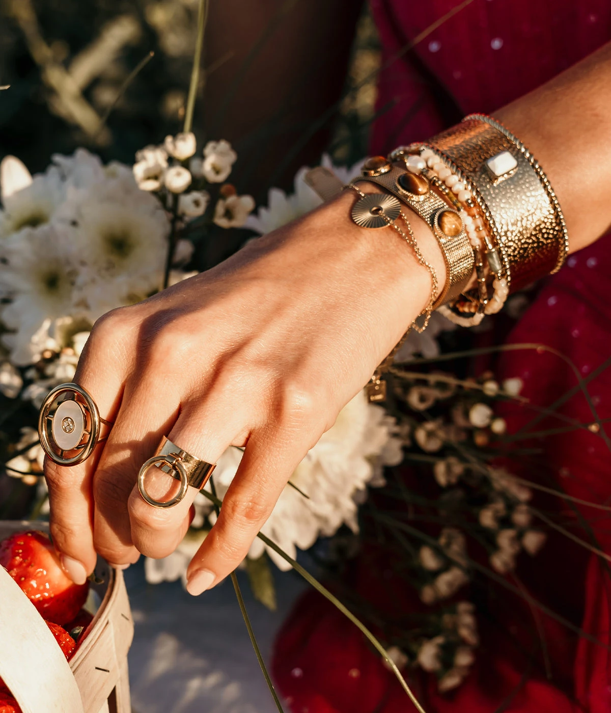 Bague ajustable en acier uni ou dorĂ© Ă l’or fin sur laquelle est accrochĂ© en son centre un anneau mobile.