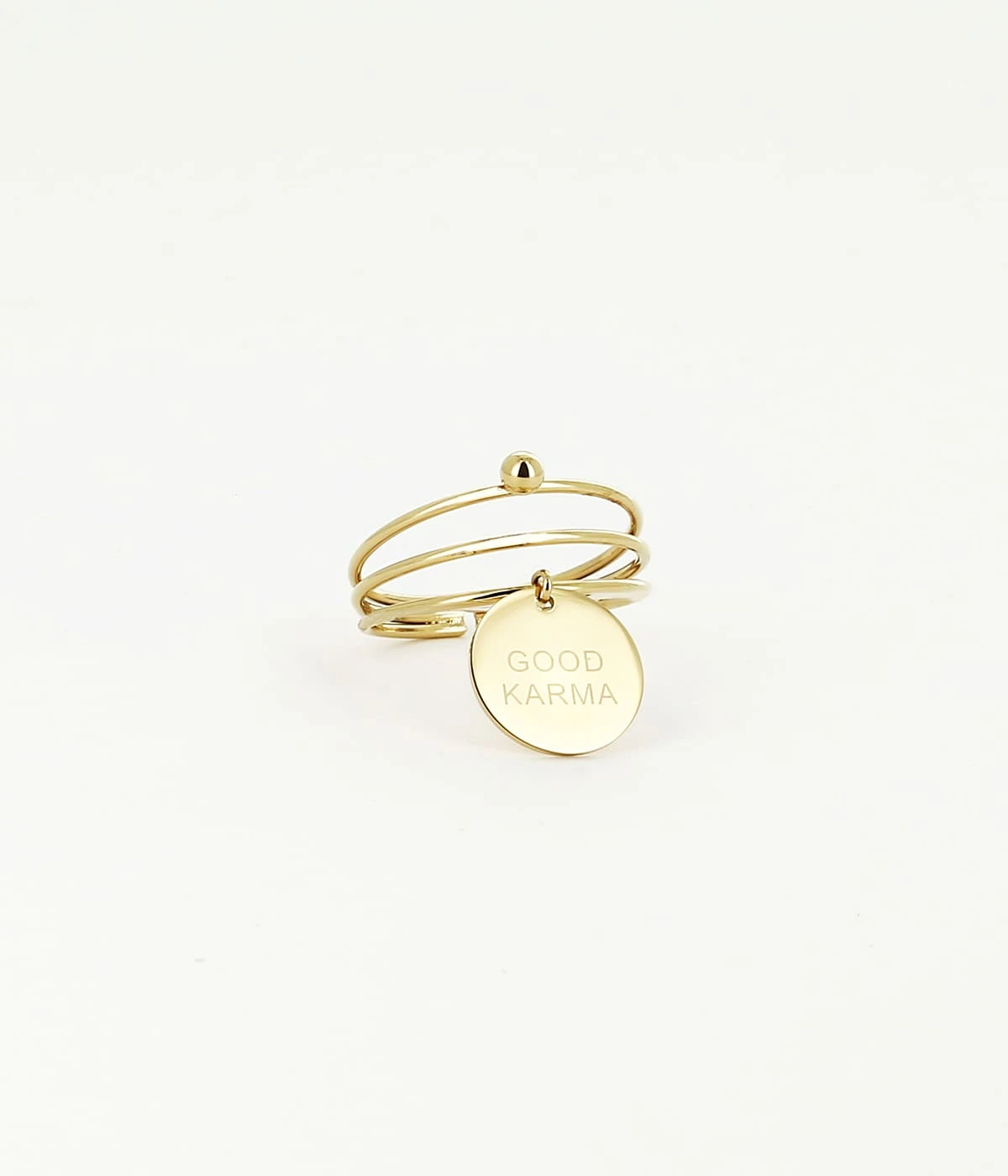 Cette bague est formée de 3 rangs avec le message « Good Karma » gravé sur un médaillon.