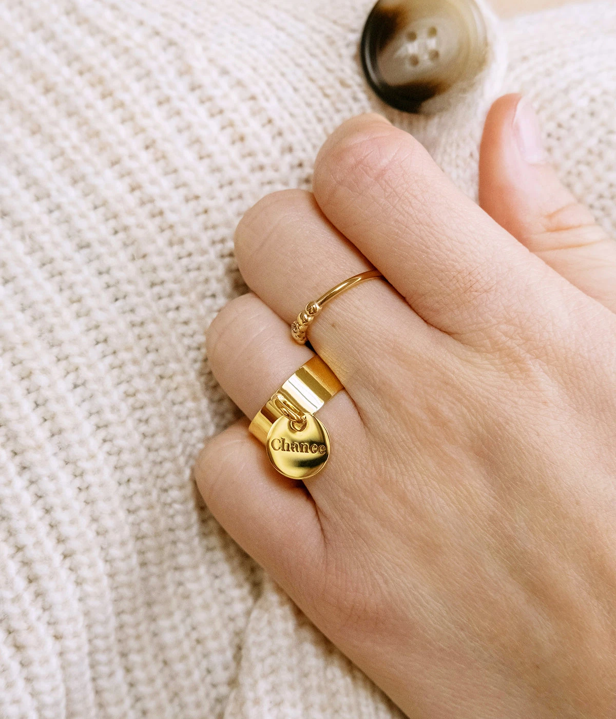 Cette bague est formĂ©e dâun mĂ©daillon ajourĂ© du mot « Chance ».