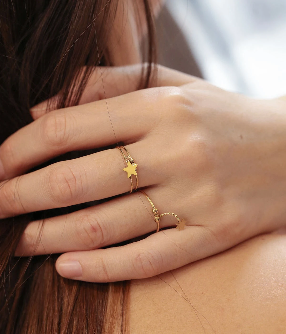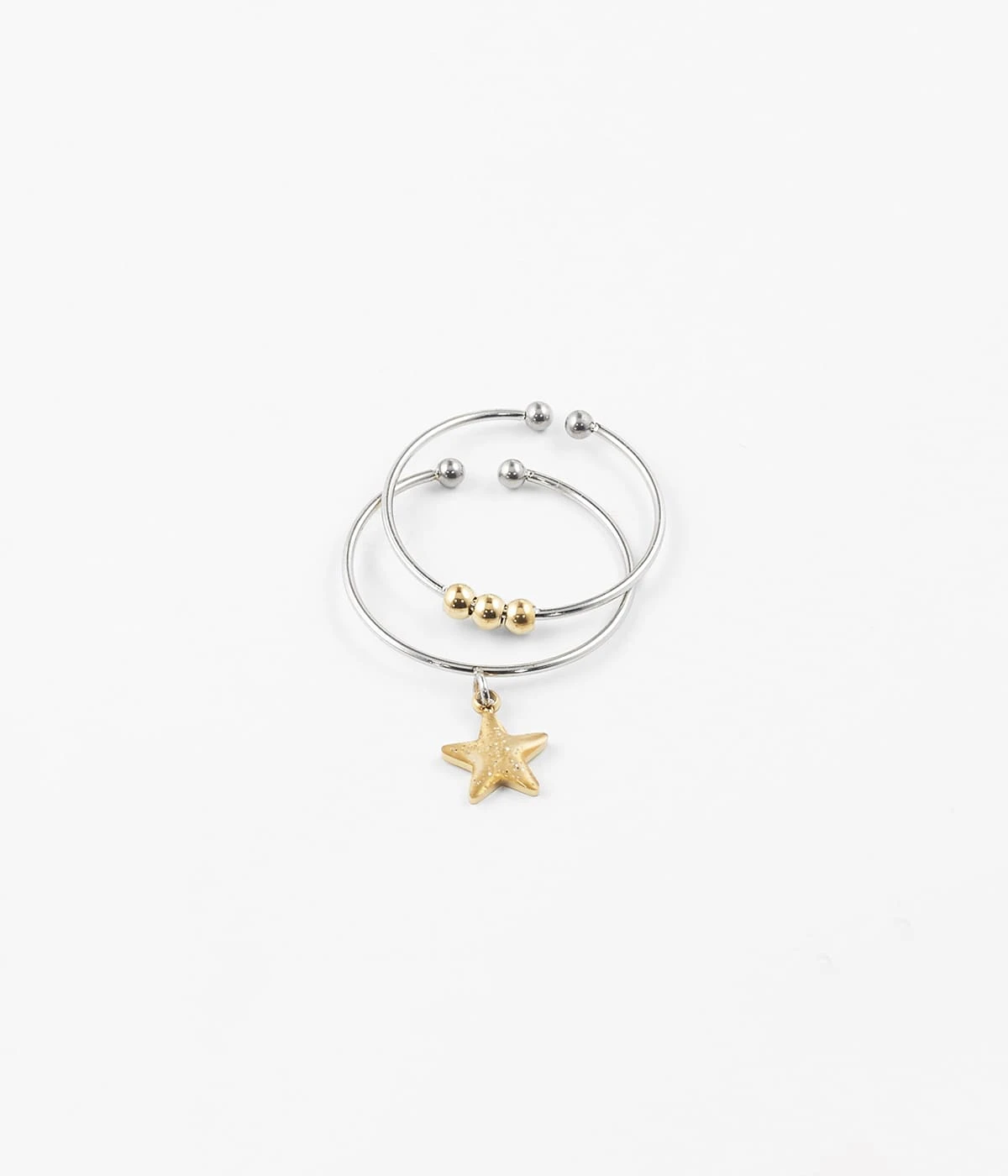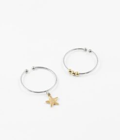 Le premier anneau est parsemé de trois petites perles de métal et sur la deuxiÚme, est attachée une petite étoile en pampille.