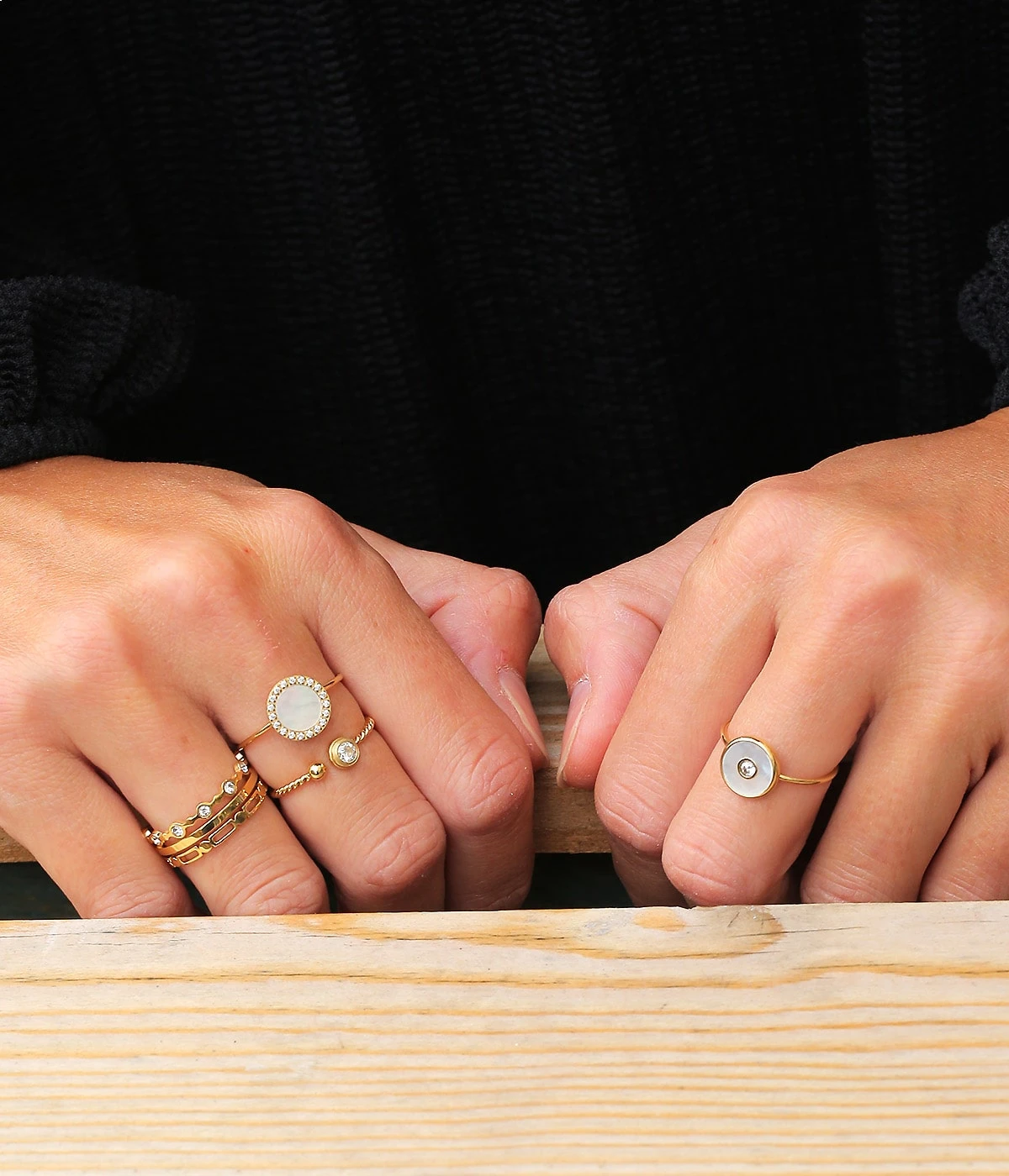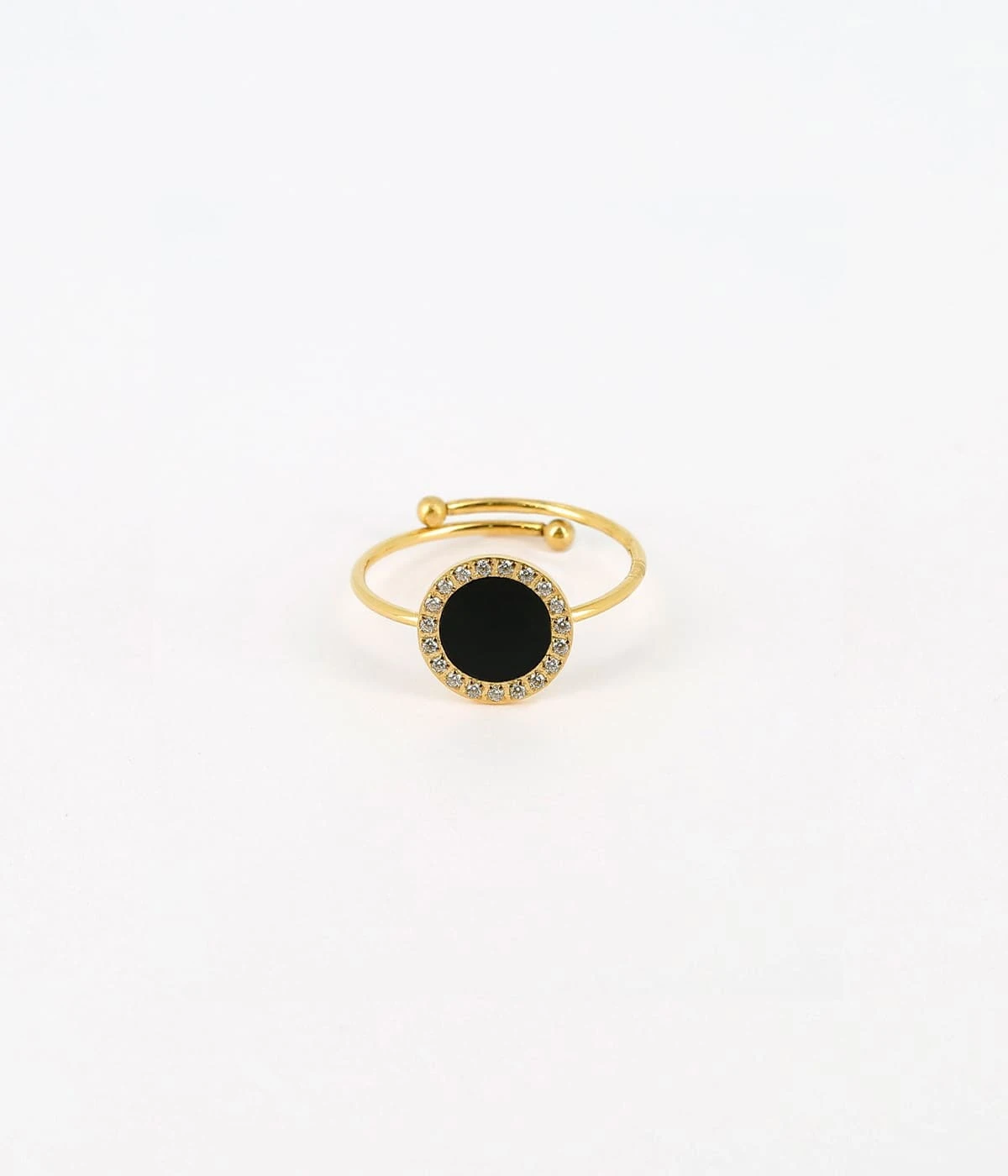 Bague en acier dorĂ© Ă lâor fin sur laquelle est attachĂ©e une mĂ©daille de nacre ou de bakĂ©lite noire. La nacre se mĂ©lange Ă lâor et la bakĂ©lite Ă lâacier blanc.