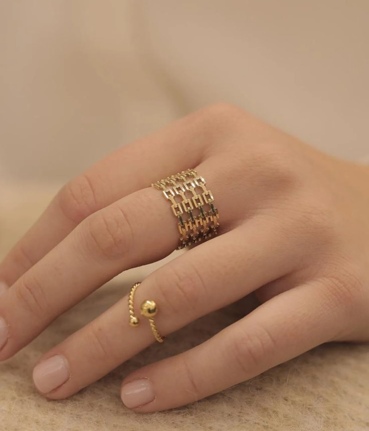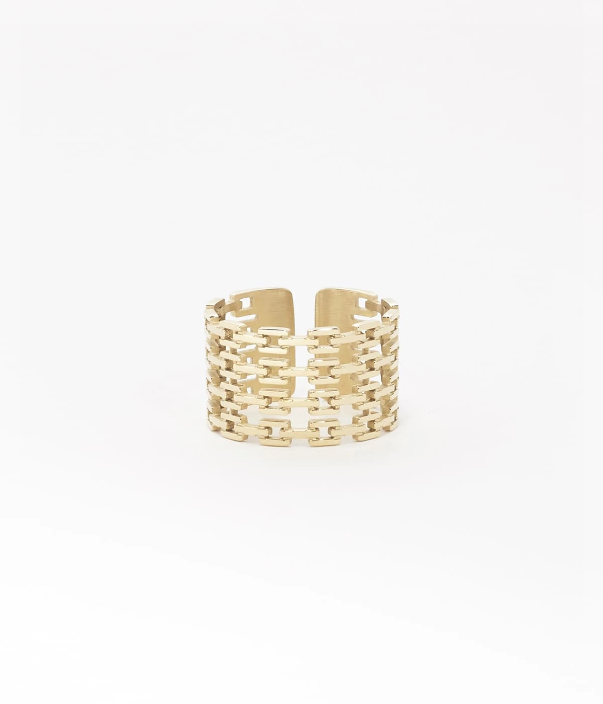 Bague ajustable en acier uni ou dorĂ© Ă l’or fin, composĂ©e de maillons rigides.