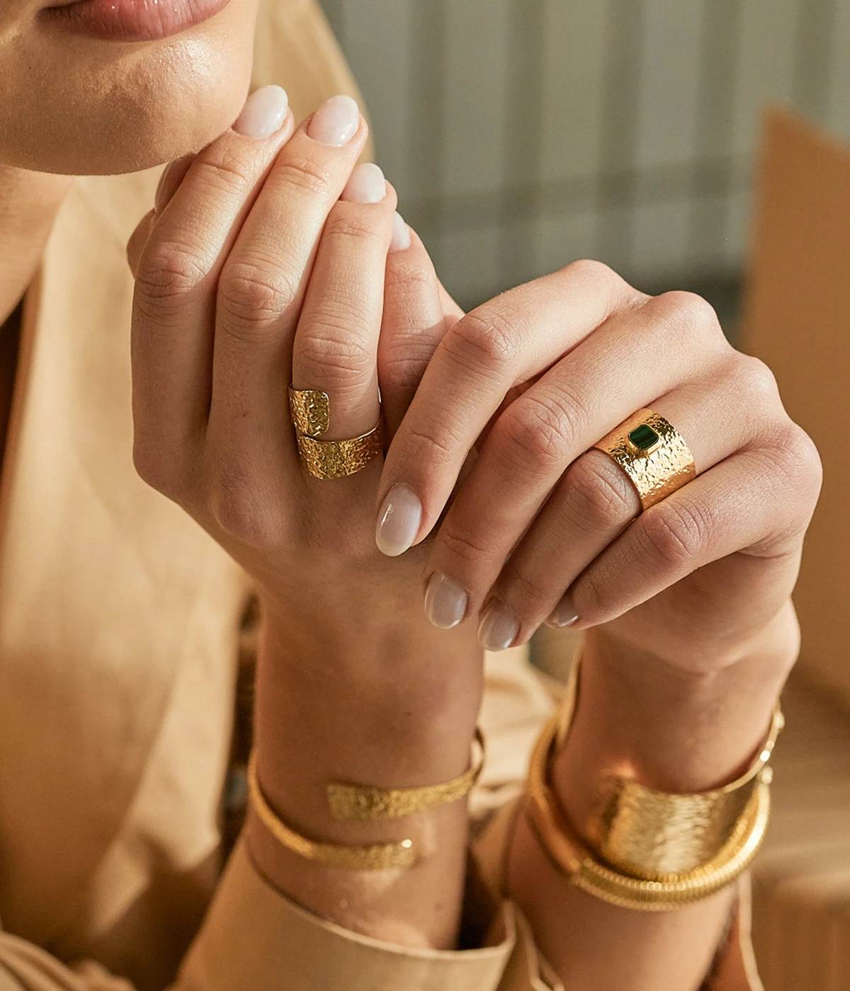 Bague martelĂ©e en acier dorĂ© Ă l’or fin avec en son centre une pierre naturelle.