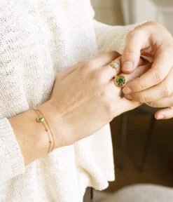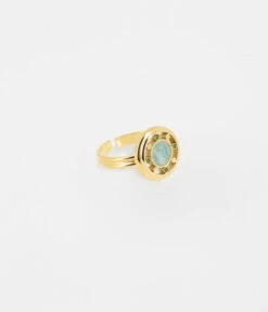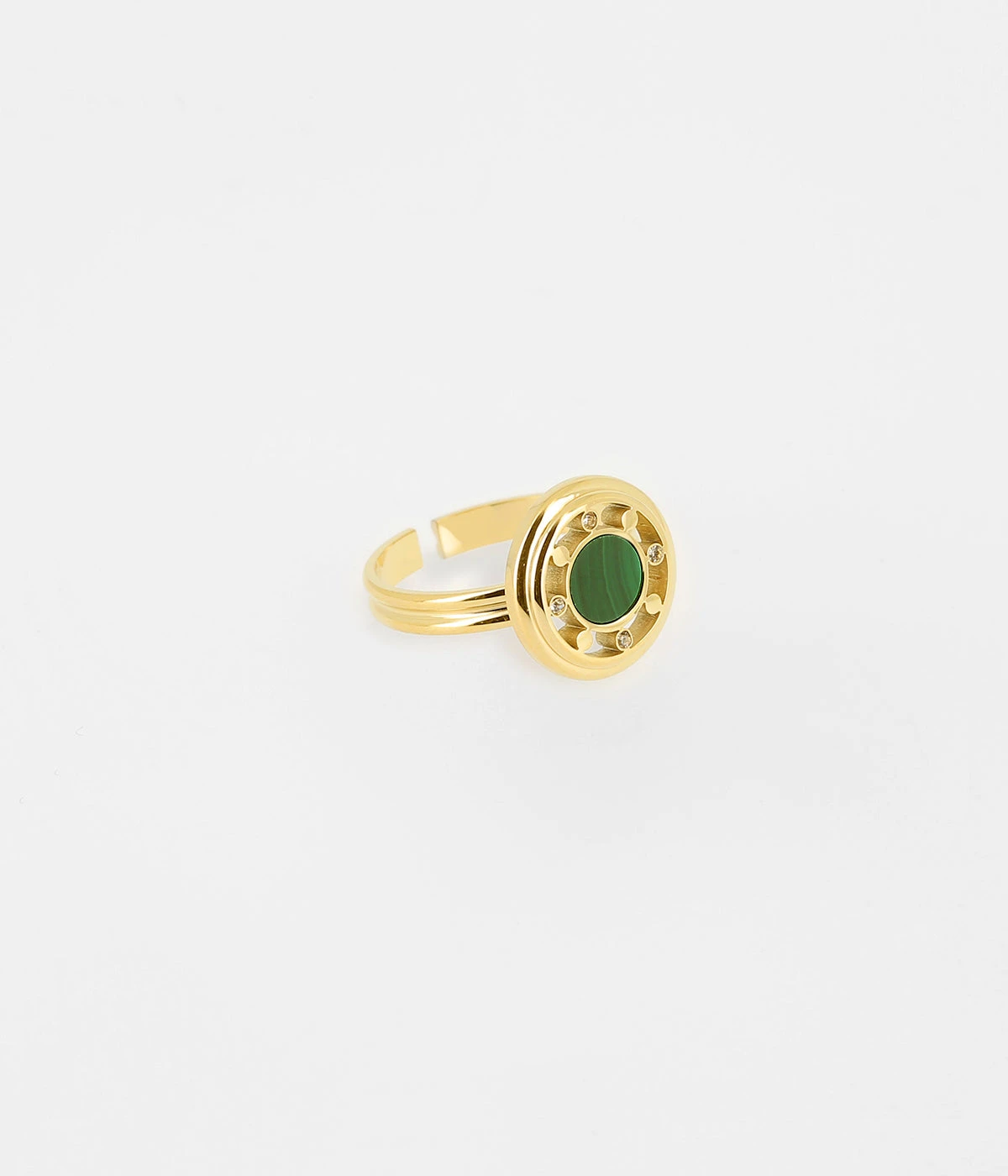 Bague ajustable en acier dorĂ© Ă l’or fin sur laquelle se trouve une forme gĂ©omĂ©trique composĂ©e de pierre naturelle en son centre et de zirconiums colorĂ©s.
