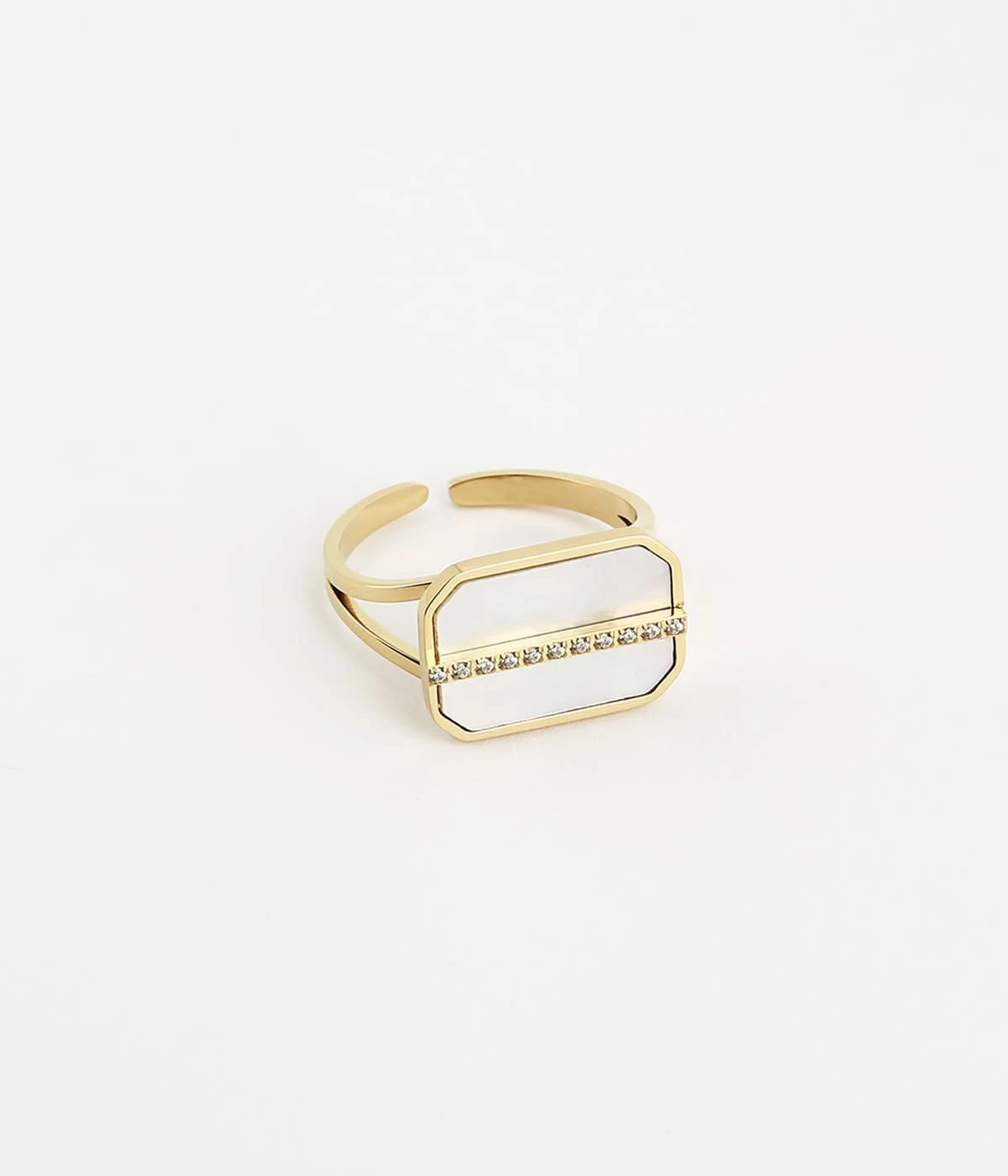 Bague ajustable en acier uni ou dorĂ© Ă lâor fin sur laquelle un rectangle de nacre serti de mĂ©tal est sĂ©parĂ© en son centre par une baguette de zirconiums.