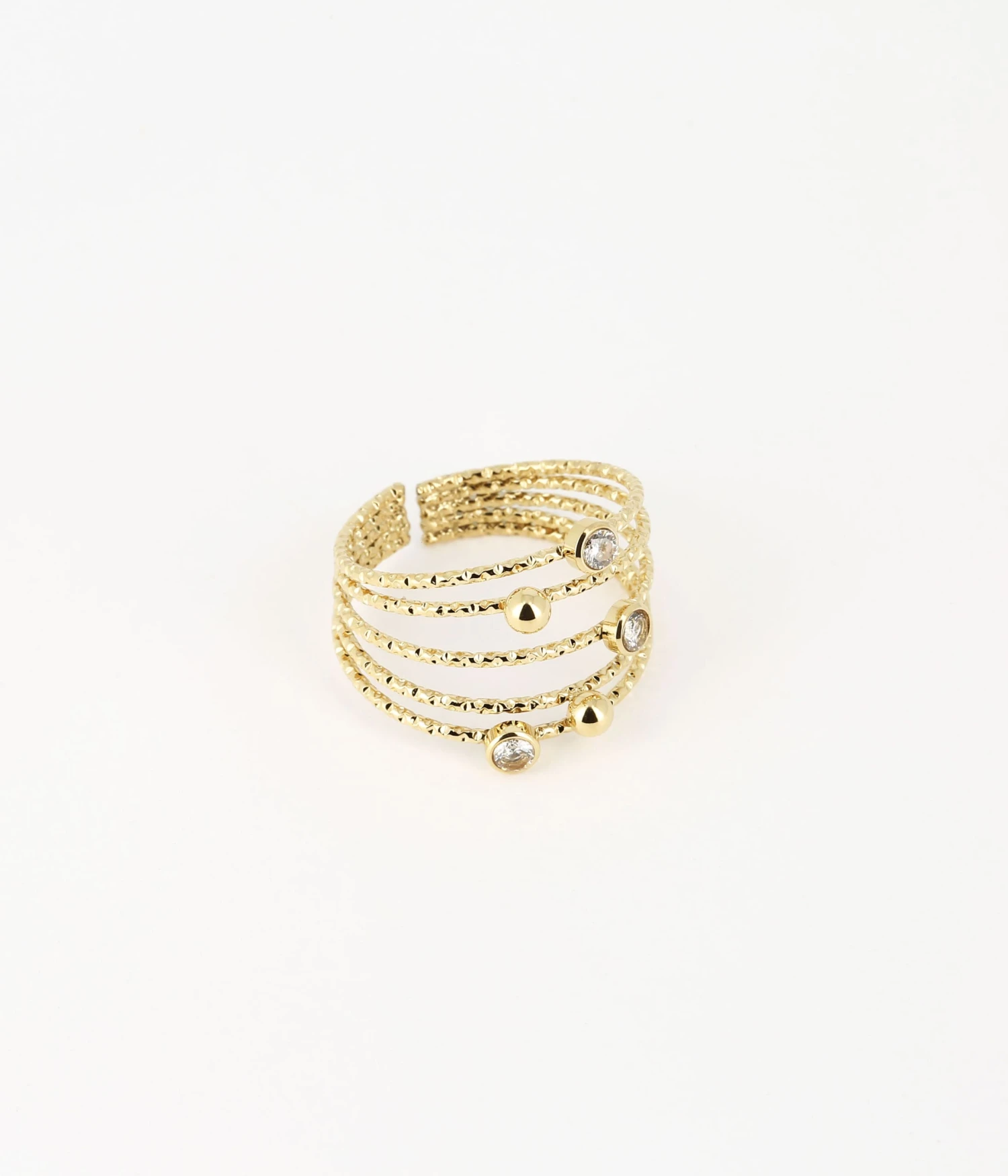 Bague en acier uni ou dorĂ© Ă lâor fin sertie de zirconiums et de petites boules dâacier. DĂ©licate et ludique cette bague est formĂ©e de plusieurs anneaux rassemblĂ©s.