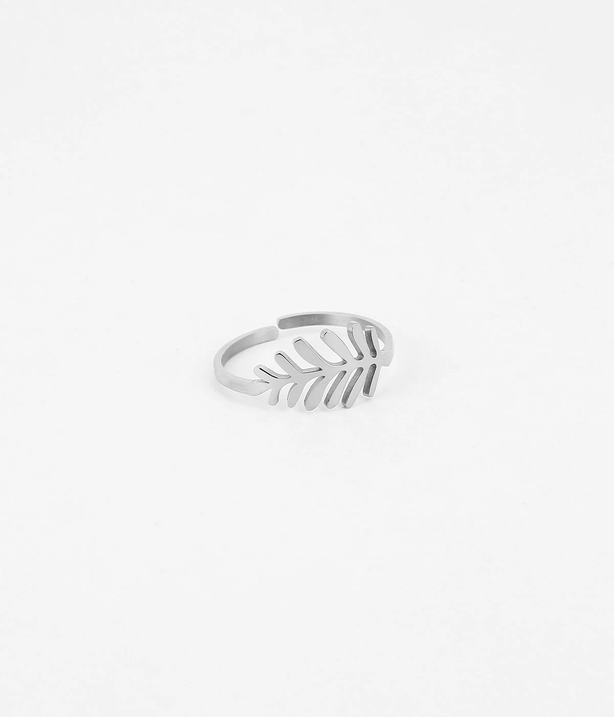 Bague ajustable en acier uni ou dorĂ© Ă l’or imitant une branche d’olive.