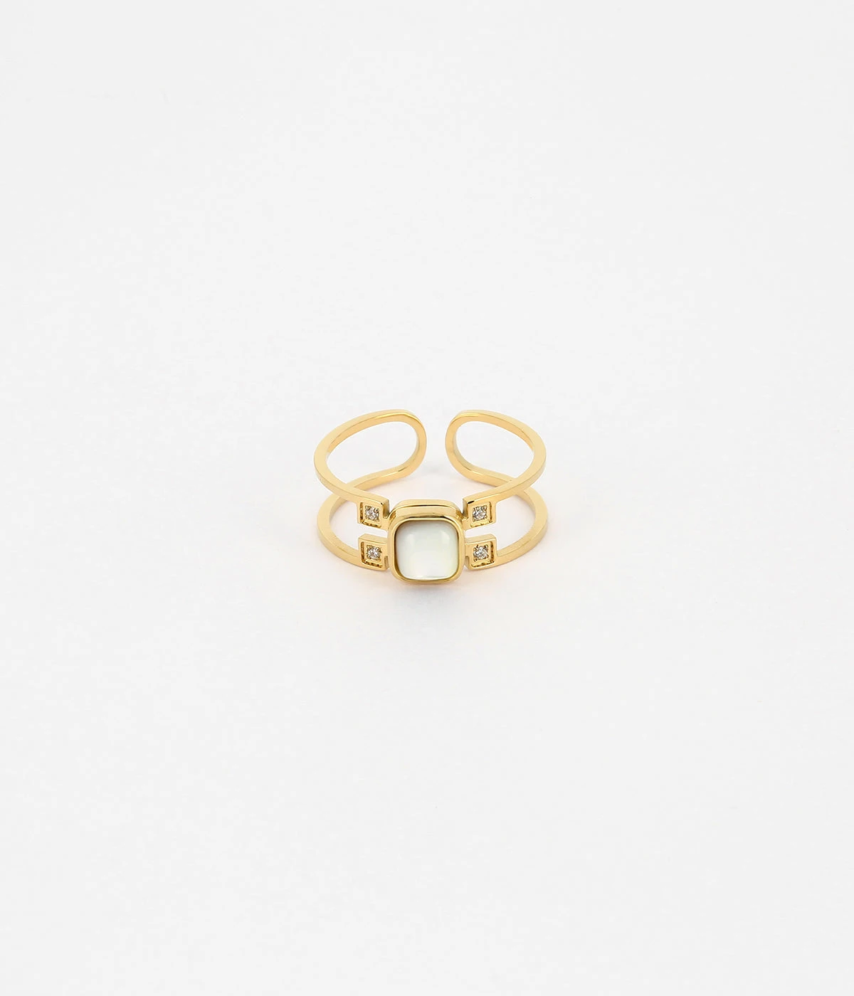 La finesse de cette bague est remarquable. Elle est ornĂ©e d’une nacre entourĂ©e par quatre petits zirconiums.Â
