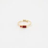 Double bague ajustable en acier dorĂ© Ă l’or fin. Le premier anneau est composĂ© d’une pierre naturelle et d’une boule d’acier dorĂ©. Le second prĂ©sente une forme gĂ©omĂ©trique pavĂ©e de zirconiums colorĂ©s.