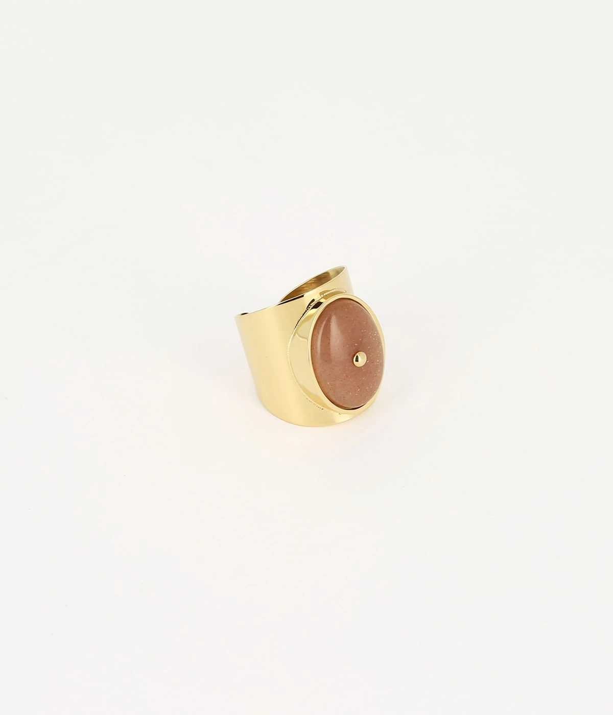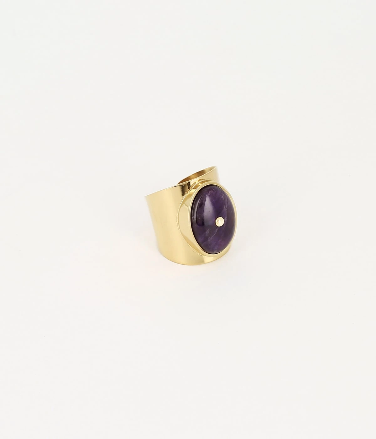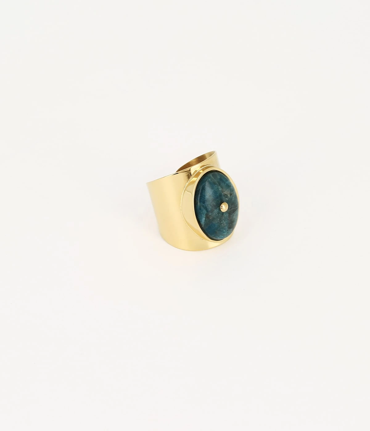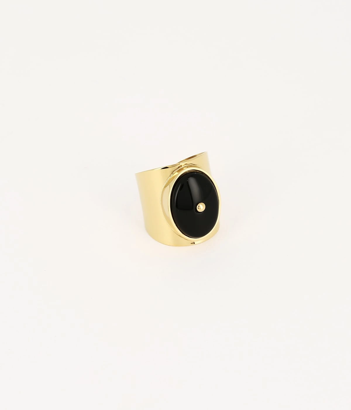 Bague large ajustable en acier uni composĂ©e d’une pierre naturelle piquĂ©e d’une boule d’acier au centre.