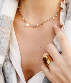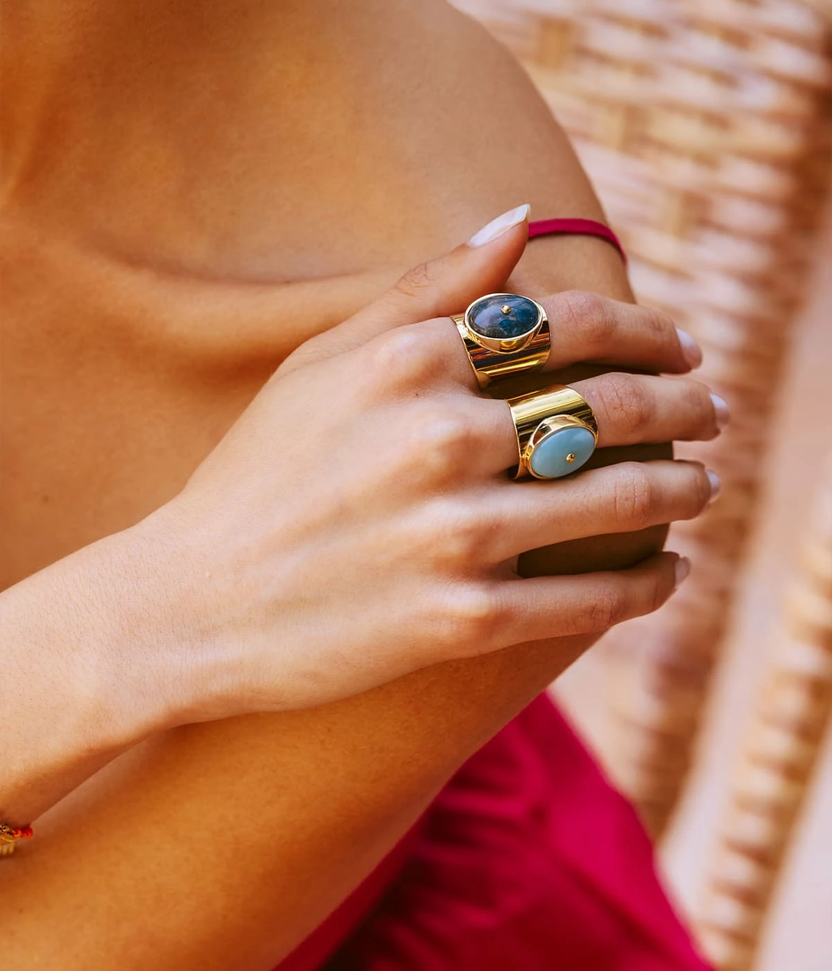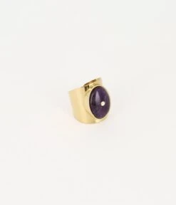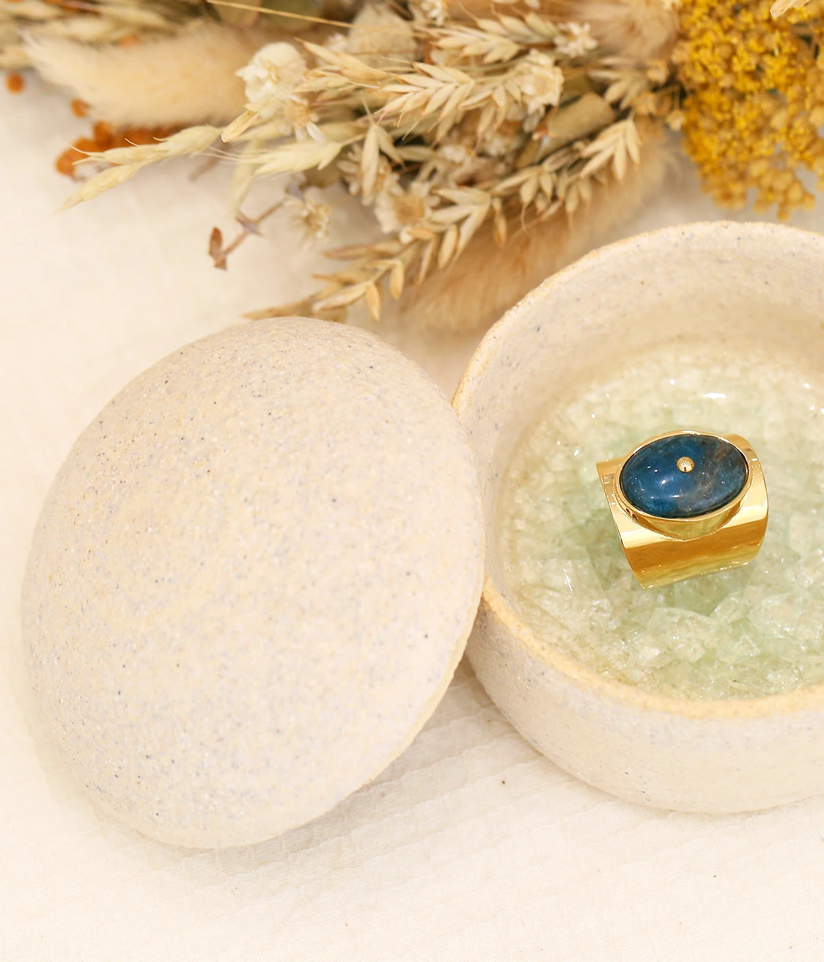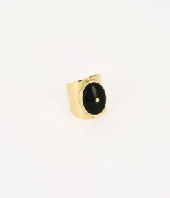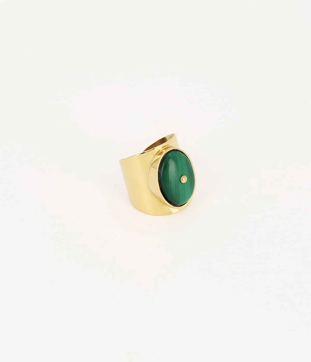 Bague large ajustable en acier uni composĂ©e d’une pierre naturelle piquĂ©e d’une boule d’acier au centre.