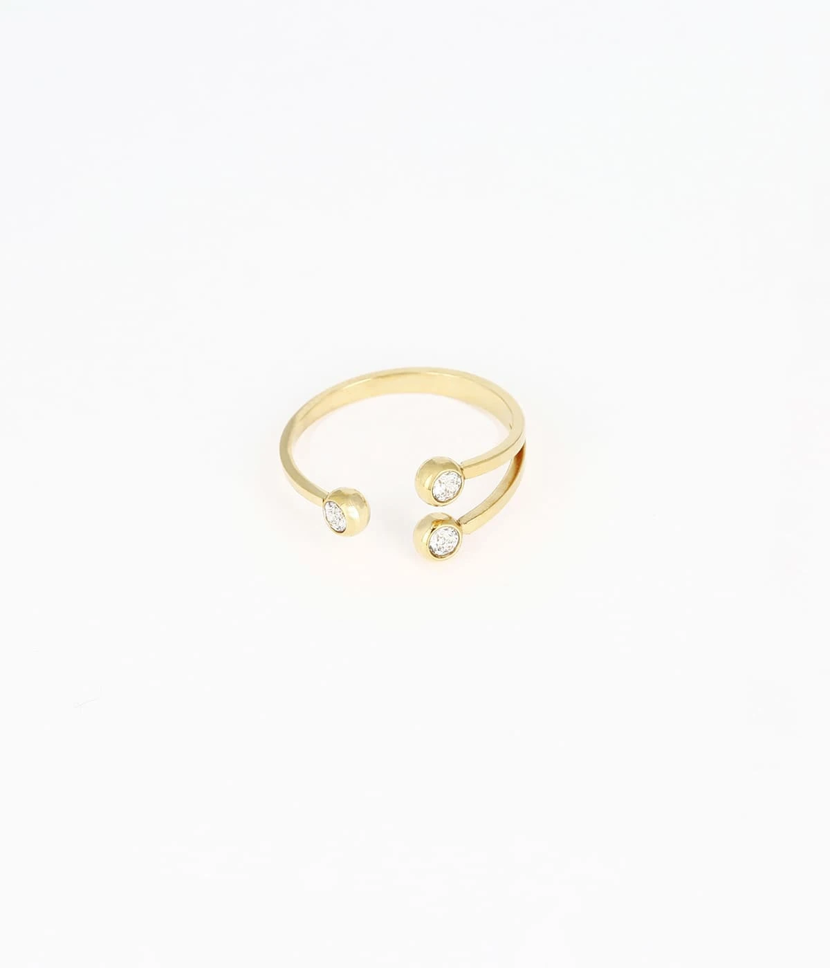 Bague ajustable en acier uni ou dorĂ© Ă lâor fin sur laquelle sont sertis trois zirconiums.
