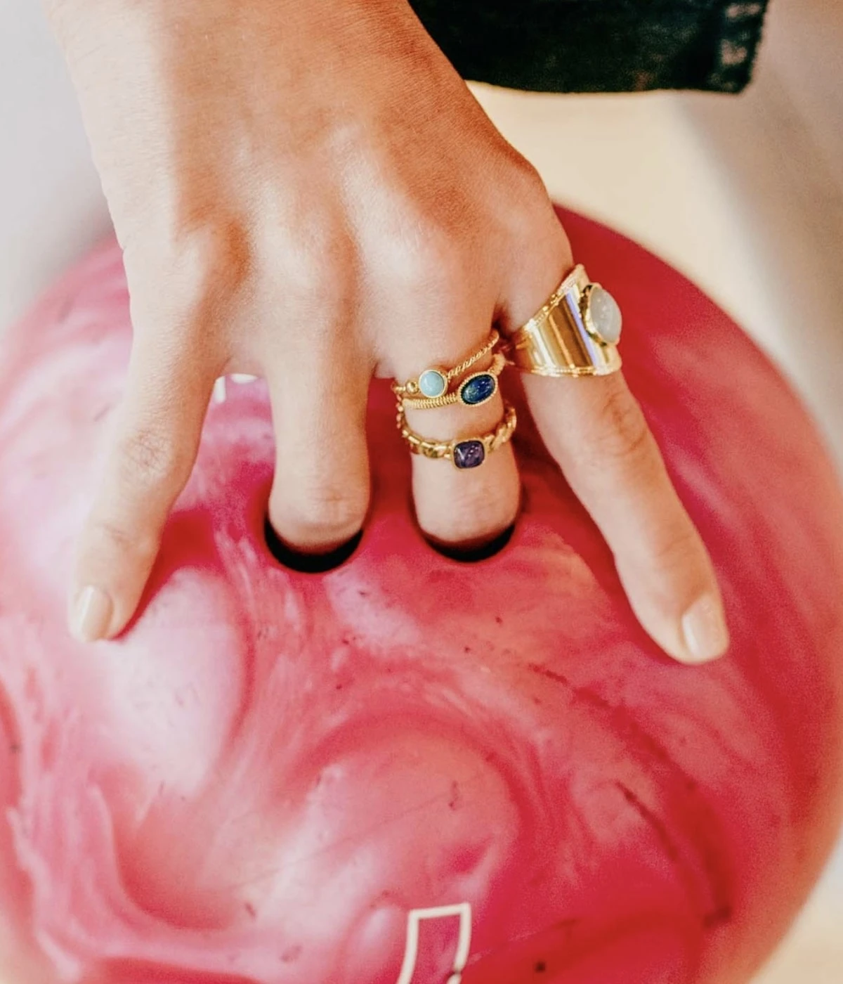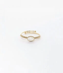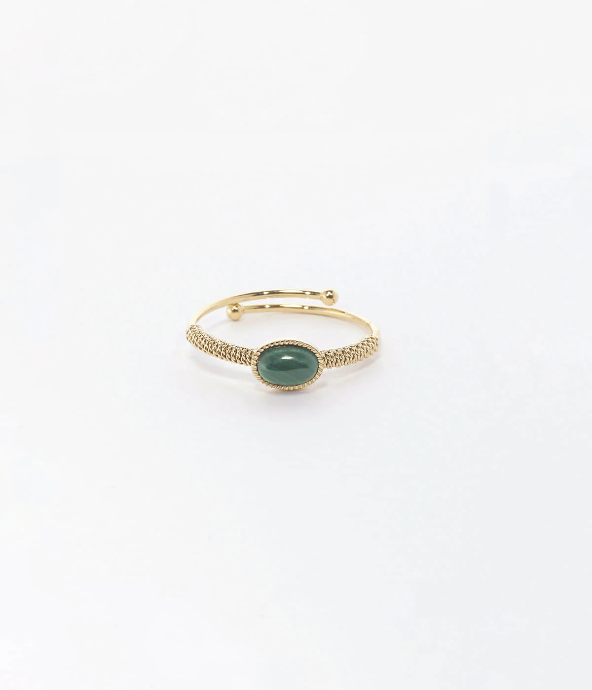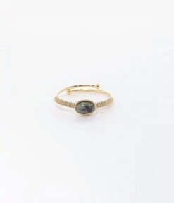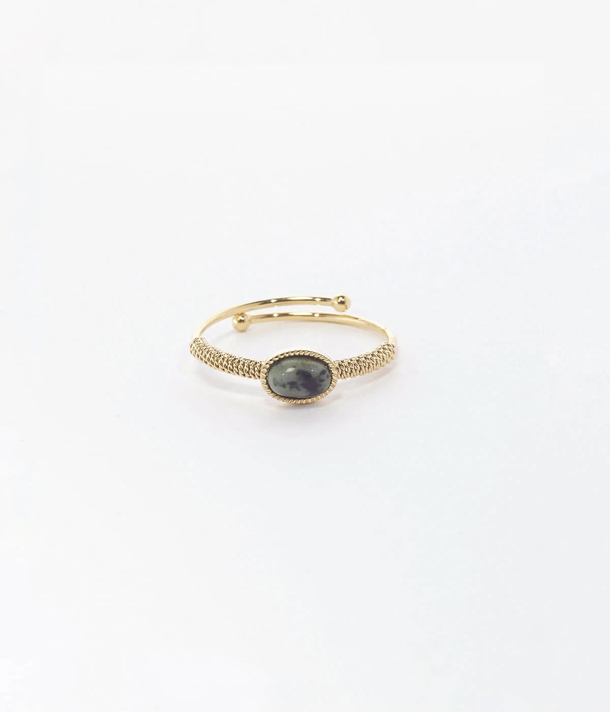 Bague ajustable en acier dorĂ© Ă l’or fin sertie en son centre d’un cabochon de pierre naturelle.