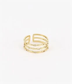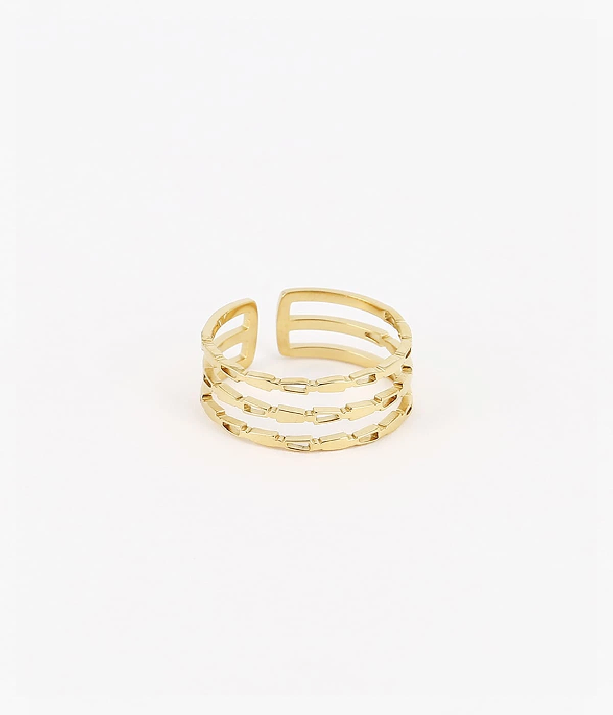 Bague ajustable en acier uni ou dorĂ© Ă lâor fin formĂ©e de trois anneaux finement martelĂ©s.