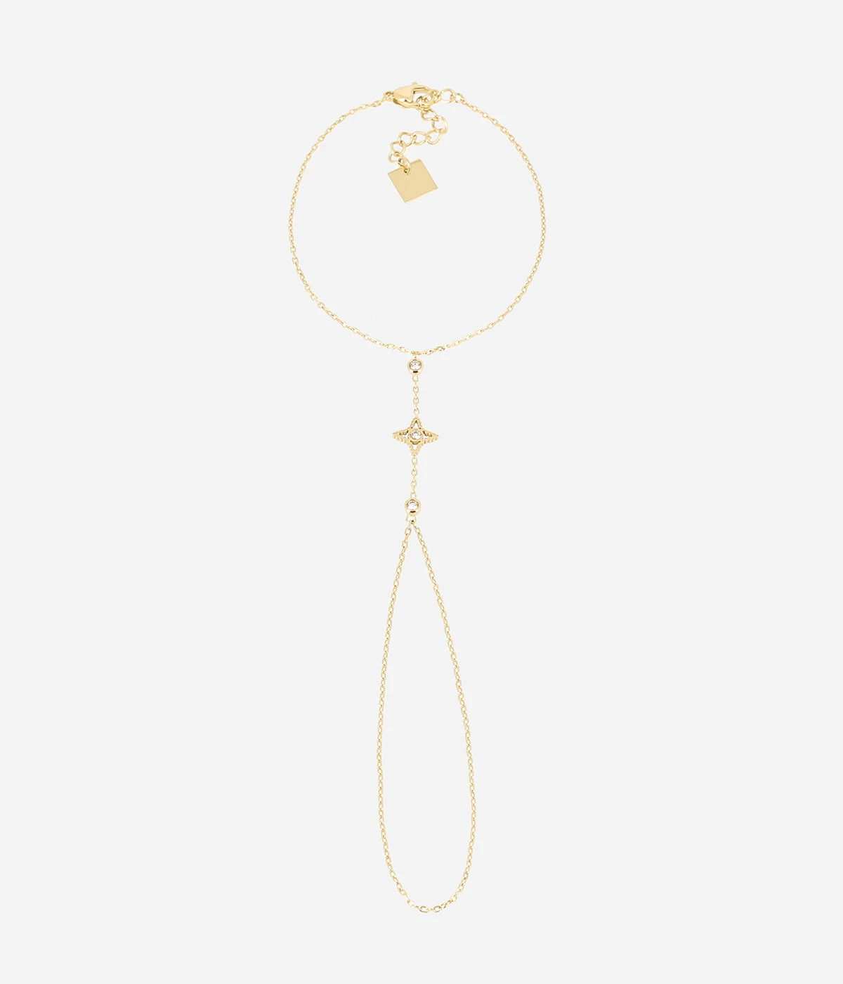 Bijou de main en acier dorĂ© Ă l’or fin oĂč une Ă©toile et des zirconiums sont prĂ©sentĂ©s.