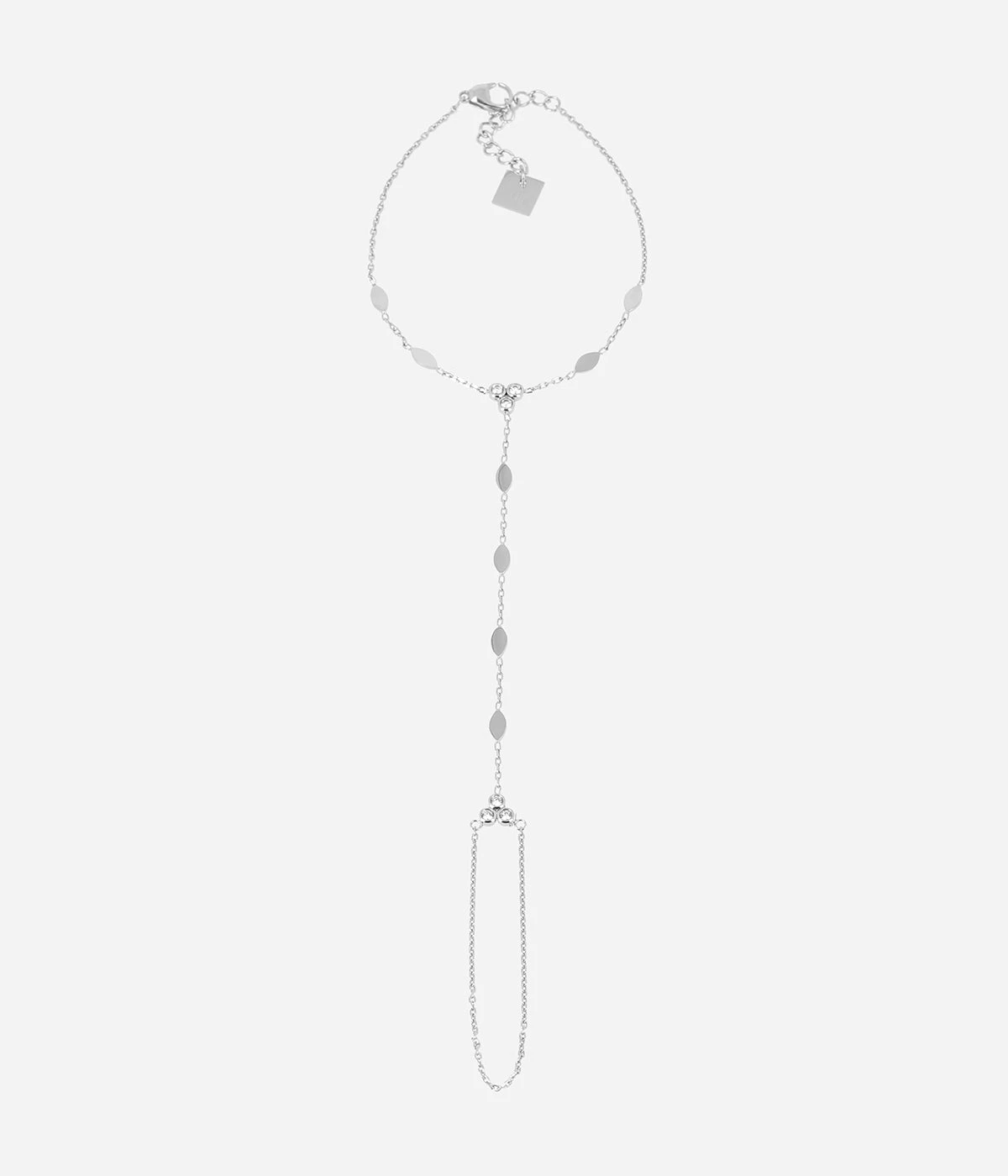 Bijou de main en acier uni ou dorĂ© Ă l’or fin sur lequel se trouvent des zirconiums et des formes gĂ©omĂ©triques parsemĂ©es.