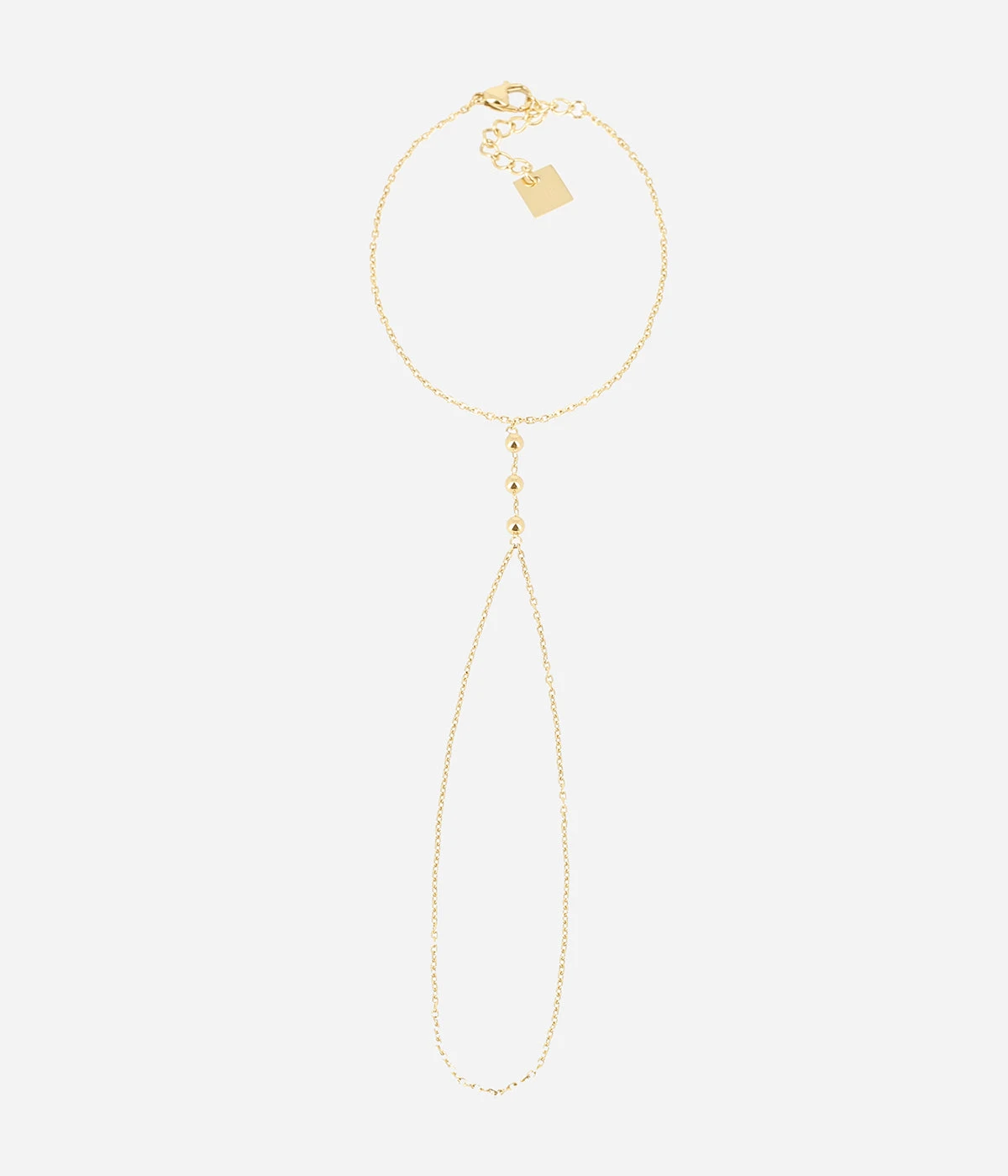 Bijou de main en acier dorĂ© Ă l’or fin oĂč se trouve trois petites boules d’acier dorĂ©.