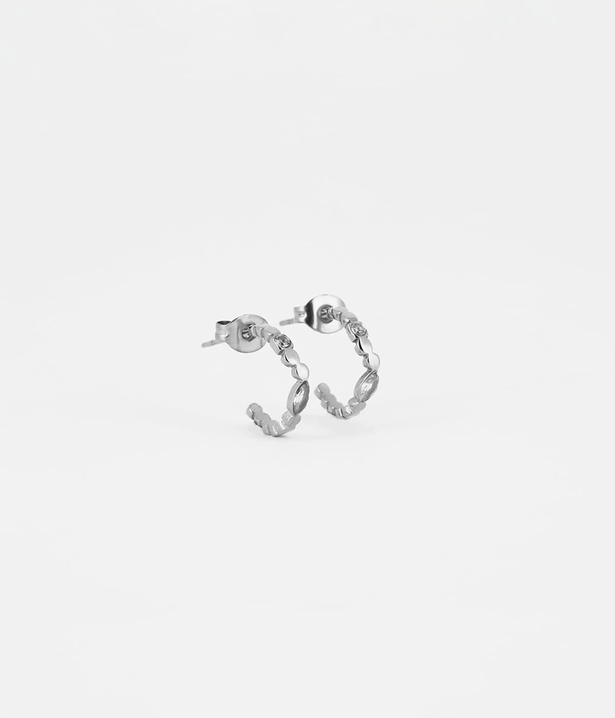 Boucles d’oreilles mini créoles en acier uni ou doré à l’or fin sur lesquelles sont sertis des petits zirconiums brillants.