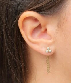 Boucles d’oreilles longues formées d’une pluie de chainettes en acier uni ou doré à l’or fin et de grappes de zirconiums. Ce bijoux à l’effet très précieux se porte très facilement et l’on peut jouer le total look avec le collier assorti.