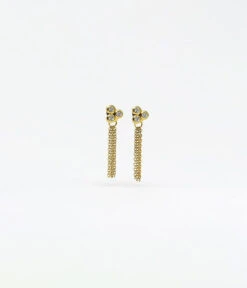 Boucles d’oreilles longues formées d’une pluie de chainettes en acier uni ou doré à l’or fin et de grappes de zirconiums. Ce bijoux à l’effet très précieux se porte très facilement et l’on peut jouer le total look avec le collier assorti.