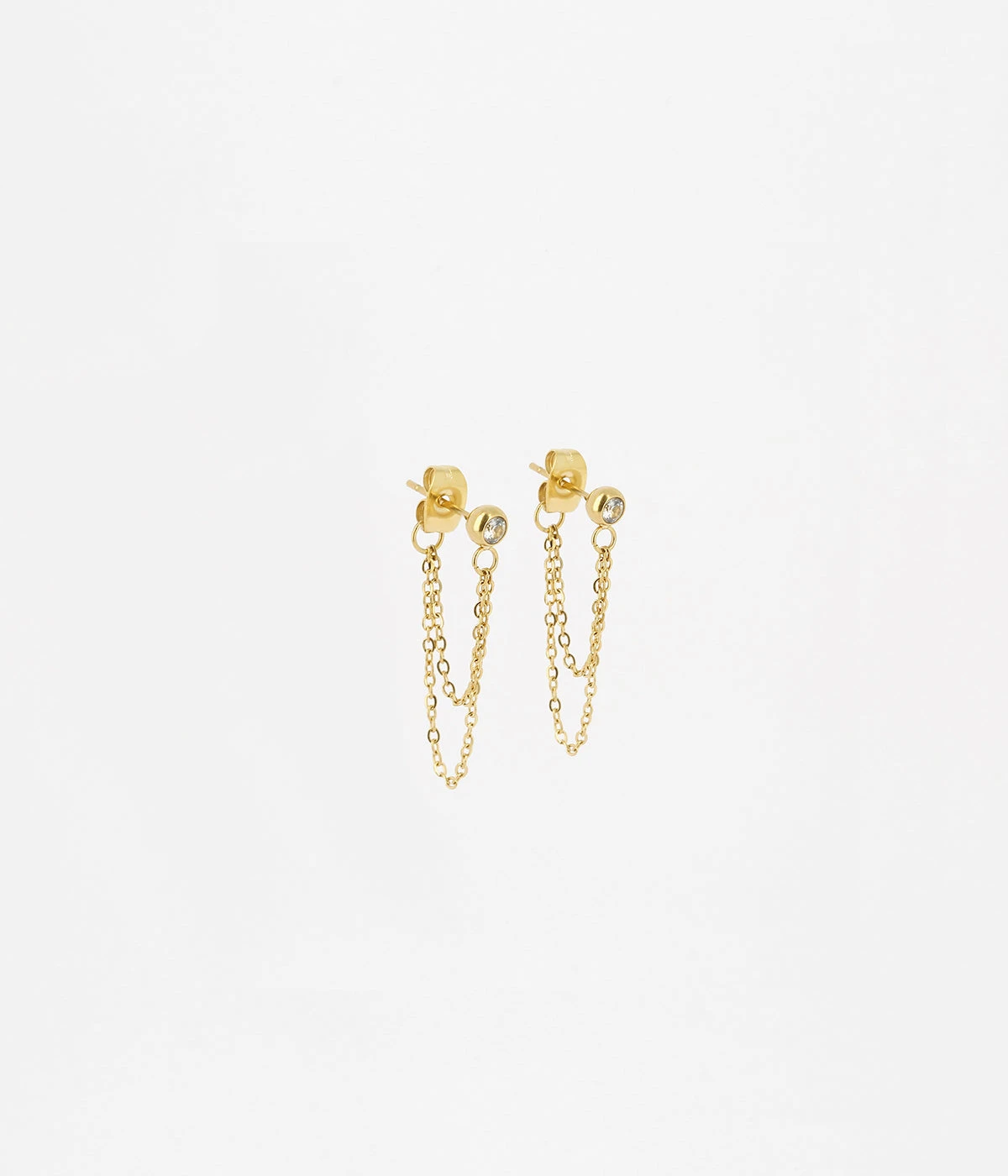 Boucles dâoreilles chaĂźnettes en acier uni ou dorĂ© Ă lâor fin avec une puce sertie de zirconiums brillants.
