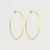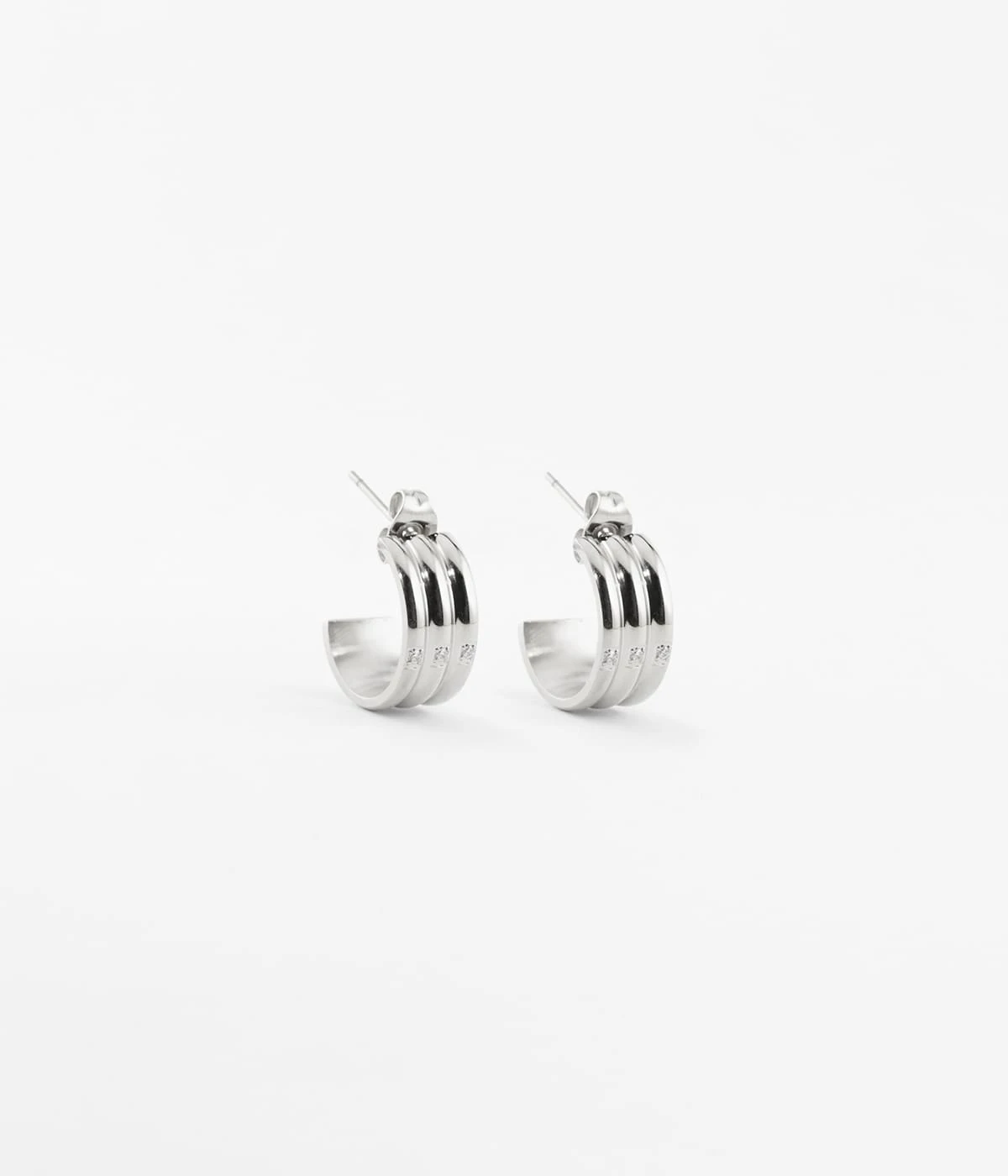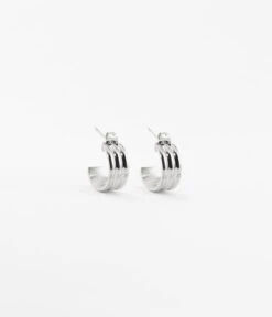 Boucles d’oreilles crĂ©oles en acier uni ou dorĂ© Ă l’or fin dont chaque boucle Ă l’apparence striĂ©e, est sertie de trois zirconiums.