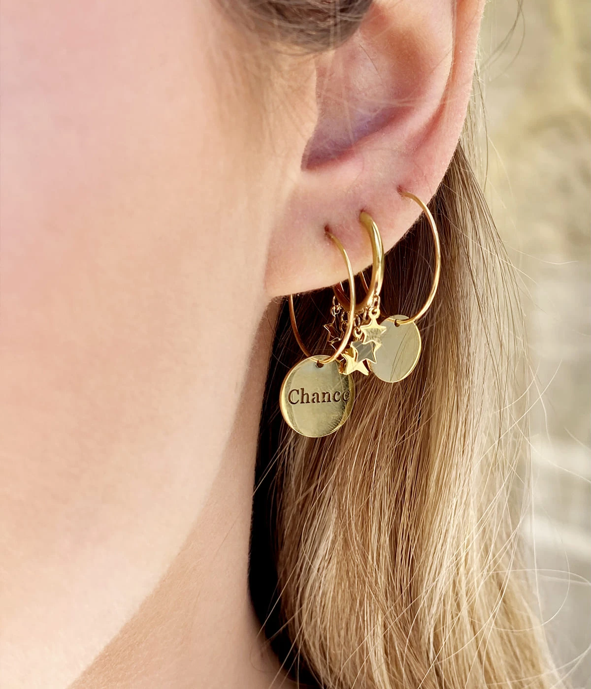 Boucles dâoreilles crĂ©oles en acier uni ou dorĂ© Ă lâor fin sur lesquelles sont suspendues cinq pampilles en forme d’Ă©toile.