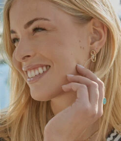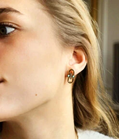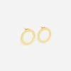 Boucles d’oreilles en acier doré à l’or fin présentant un motif de forme géométrique. Des zirconiums sont pavés en son centre.