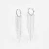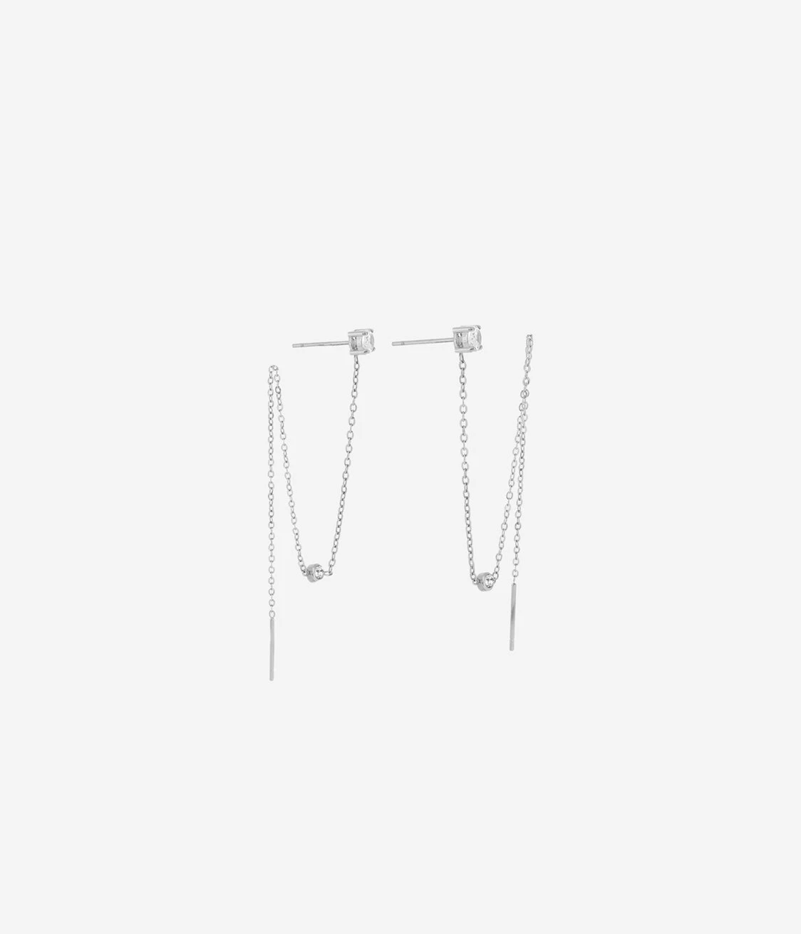 Boucles d’oreilles en acier uni ou dorĂ© Ă l’or fin. Ă la base se trouve un zirconium qui relie une longue chaĂźnette.
