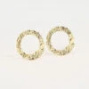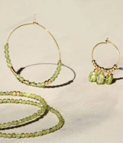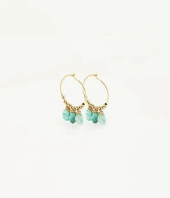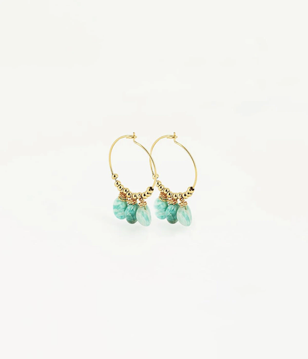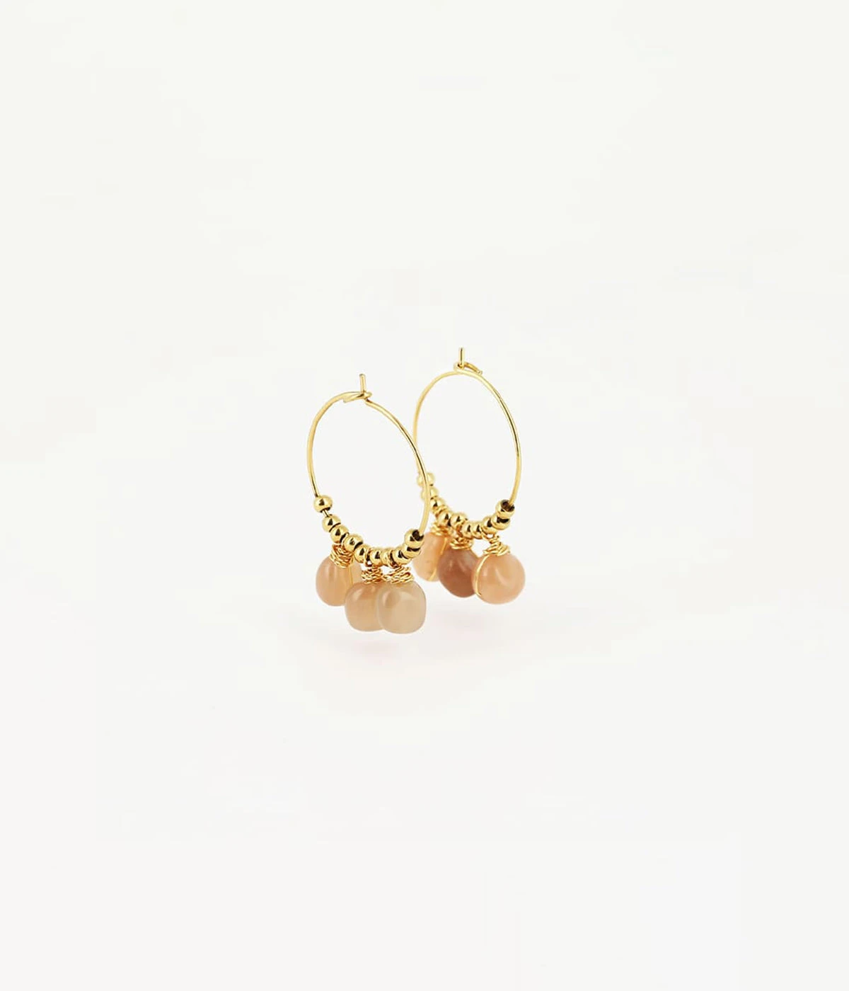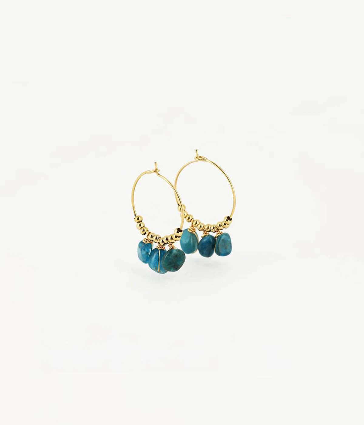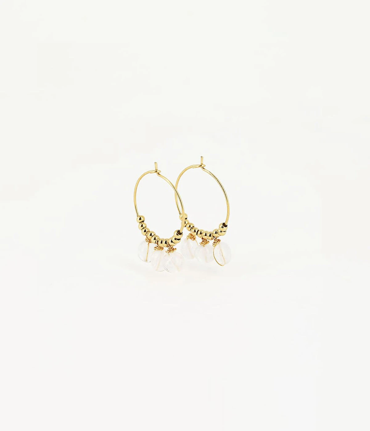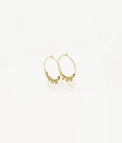 Boucles d’oreilles créoles en acier doré à l’or fin sur lesquelles des pampilles de métal et de pierres fines sont accrochées.
