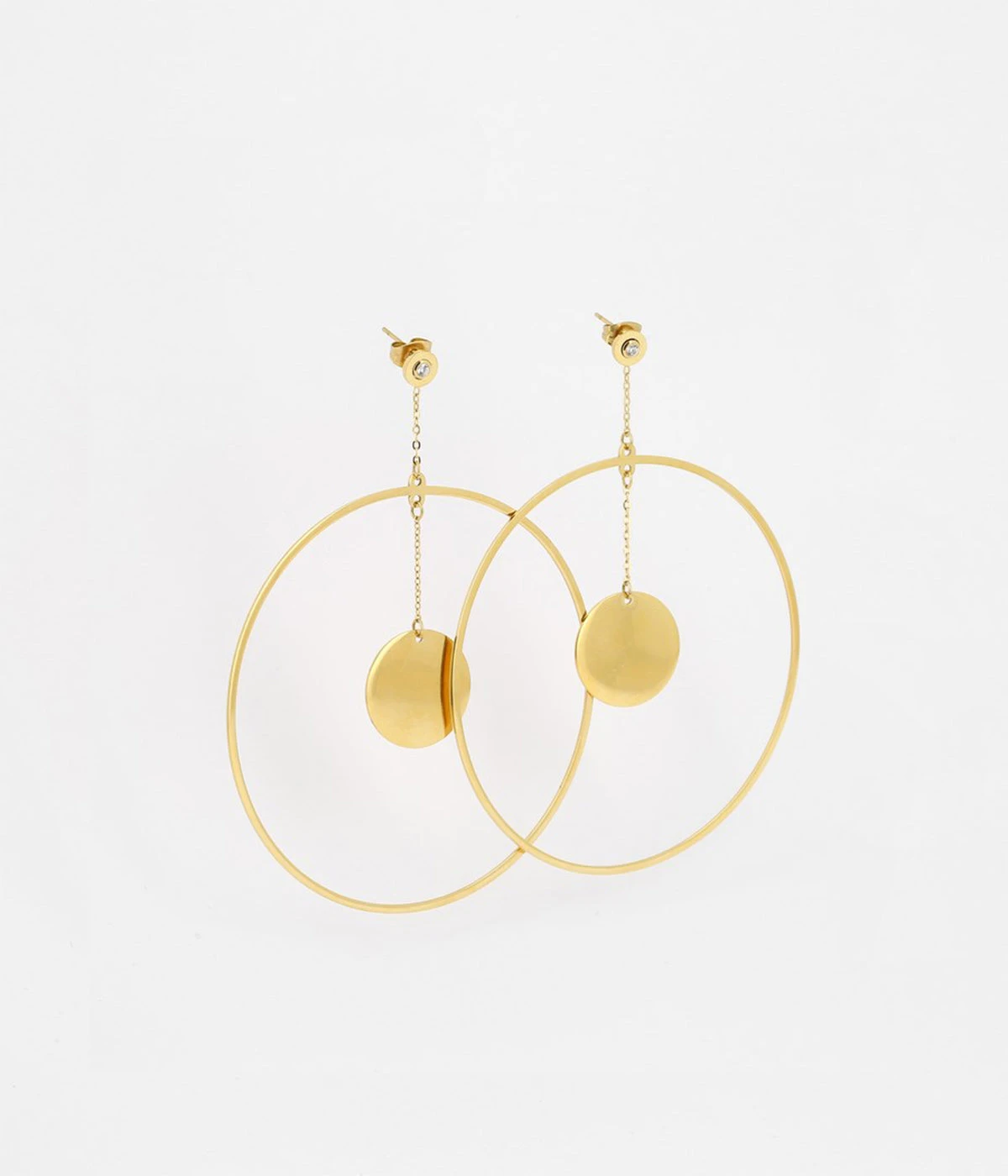 Boucles d’oreilles en acier dorĂ© Ă l’or fin. Une chaĂźnette relie un anneau et un motif de forme ronde.