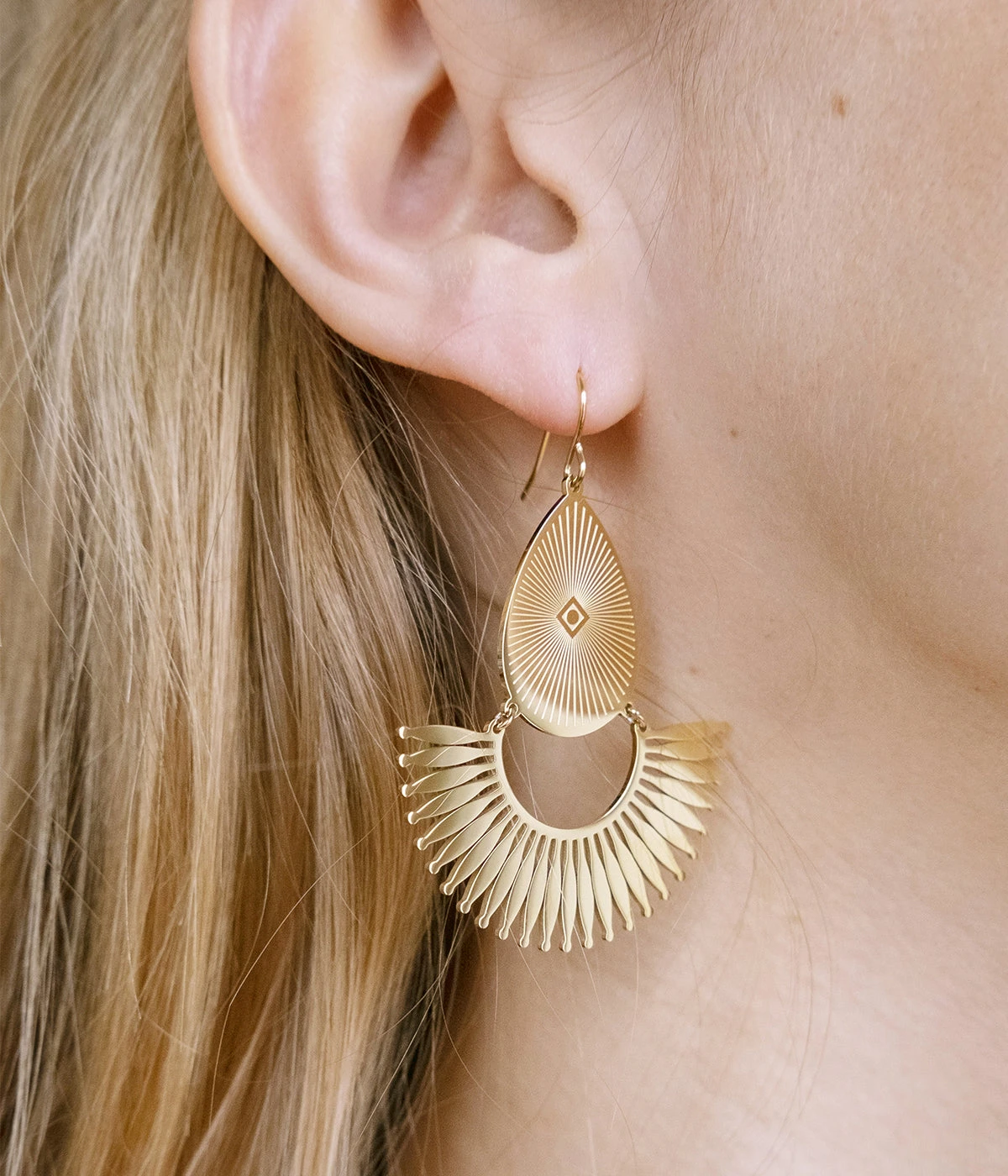 Boucles d’oreilles en acier uni ou dorĂ© Ă l’or fin composĂ©es de petites pendeloques striĂ©es auxquelles sont suspendus des cercles Ă l’aspect dentelĂ©.