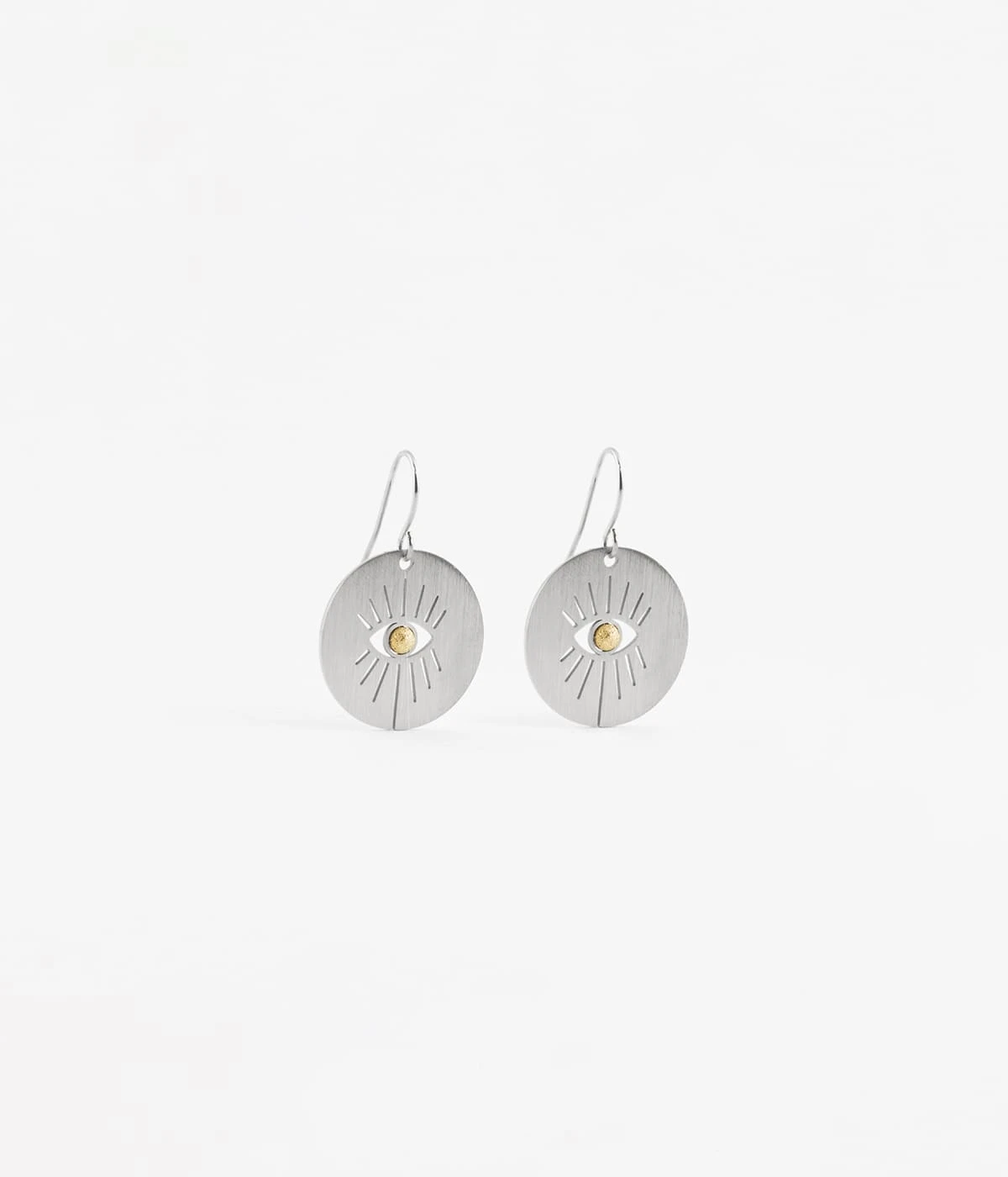 Boucles d’oreilles dormeuses, en acier uni ou dorĂ© Ă l’or fin sur lesquelles sont attachĂ©es deux mĂ©dailles au motif d’inspiration Ă©gyptienne.