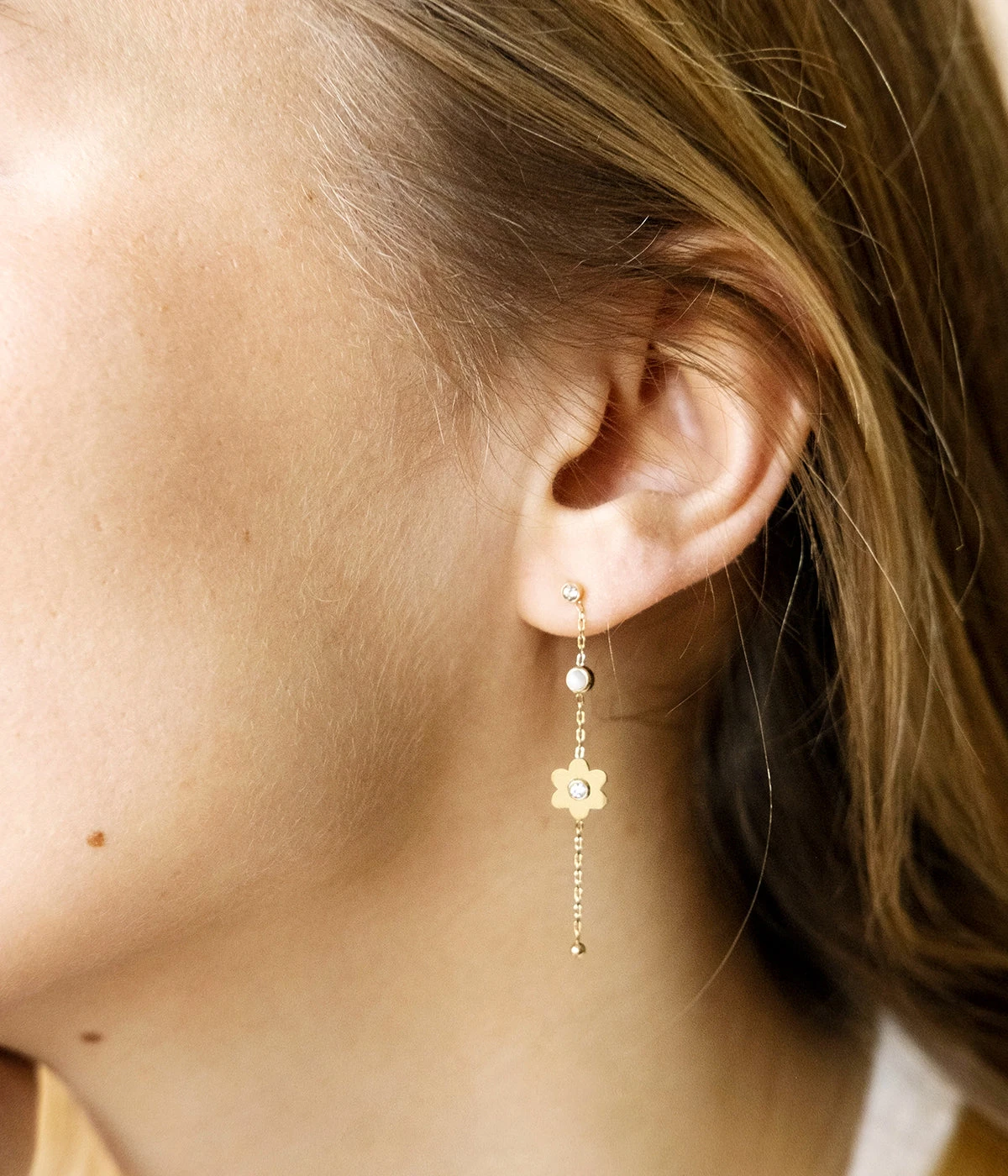 Boucles d’oreilles en acier dorĂ© Ă l’or fin faites d’une chaĂźnette sur laquelle se trouvent un zirconium, une pierre colorĂ©e et un motif de fleur sertie d’un zirconium.