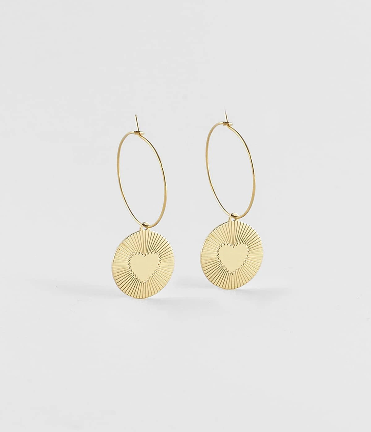 Boucles d’oreilles crĂ©oles en acier uni ou dorĂ© Ă l’or fin dĂ©corĂ©es de deux pastilles striĂ©es gravĂ©es d’un cĆur.