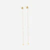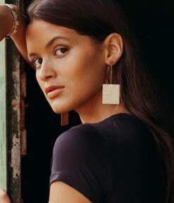 Boucles d’oreilles en acier dorĂ© Ă l’or fin. Une chaĂźnette relie une puce Ă une forme carrĂ©e martelĂ©e.