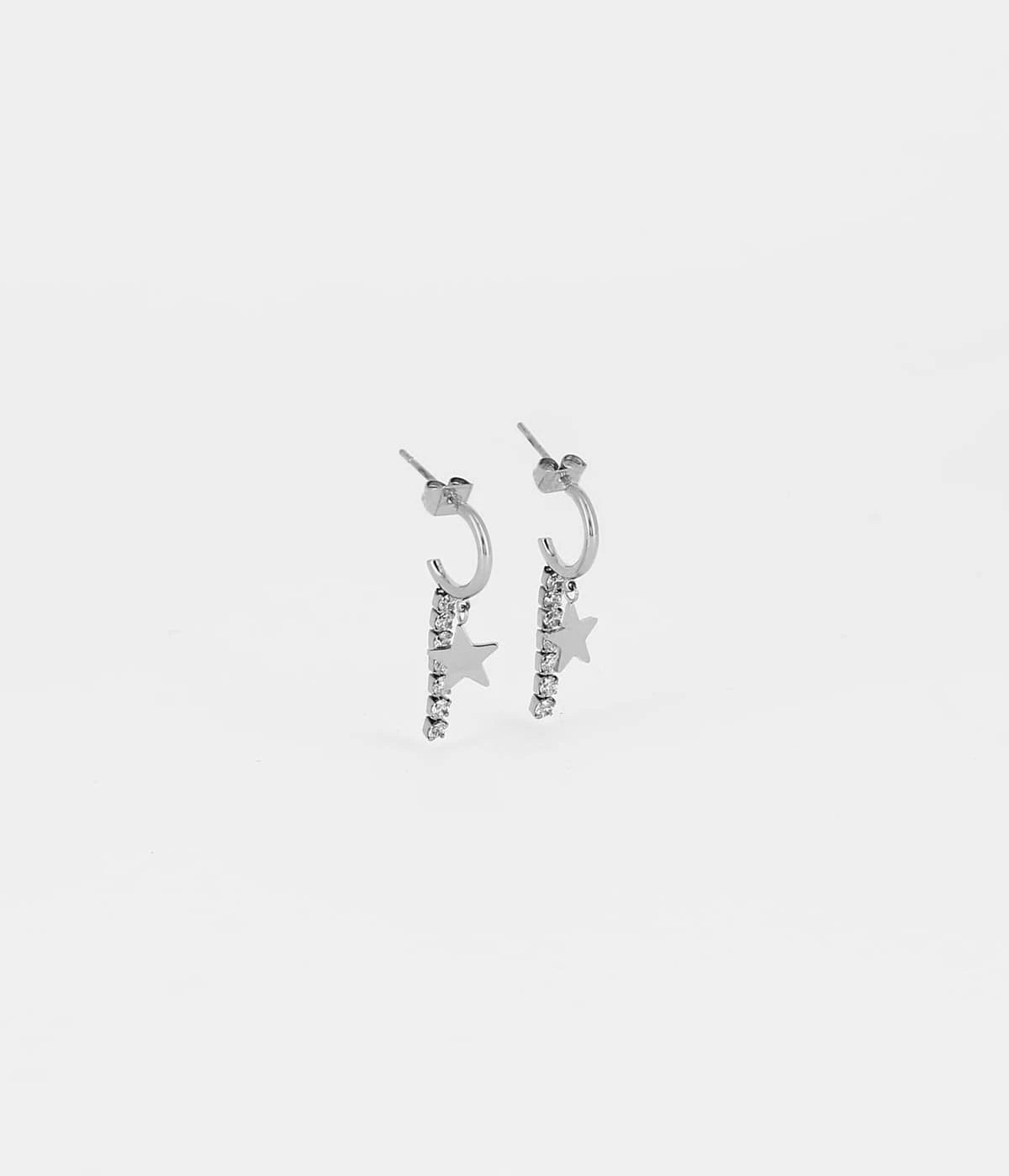 Petites boucles d’oreilles en acier uni ou dorĂ© Ă l’or fin sur lesquelles sont suspendues une petite Ă©toile en acier et une succession de zirconiums en sertissage carrĂ©.