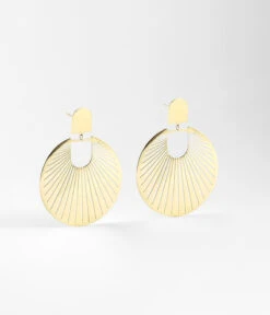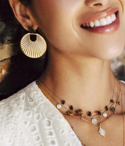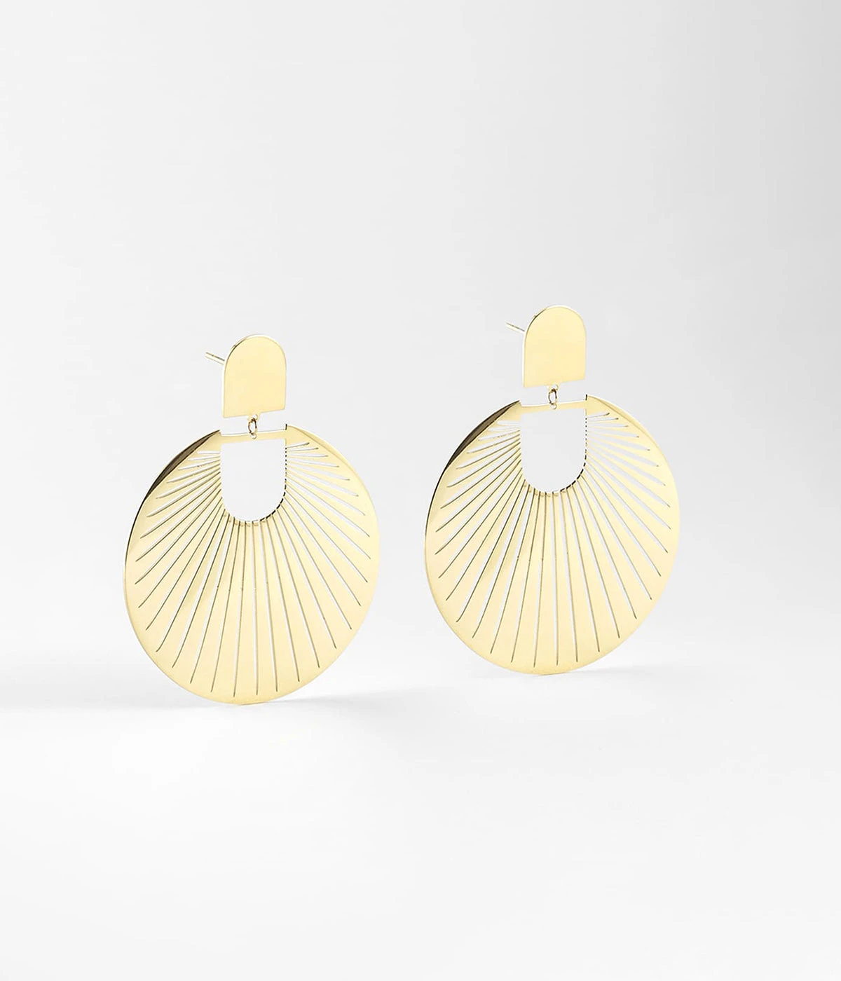 Boucles d’oreilles longues en acier uni ou dorĂ© Ă l’or fin, formĂ©es d’une grande corolle travaillĂ©e comme un Ă©ventail.