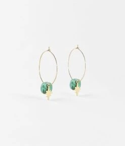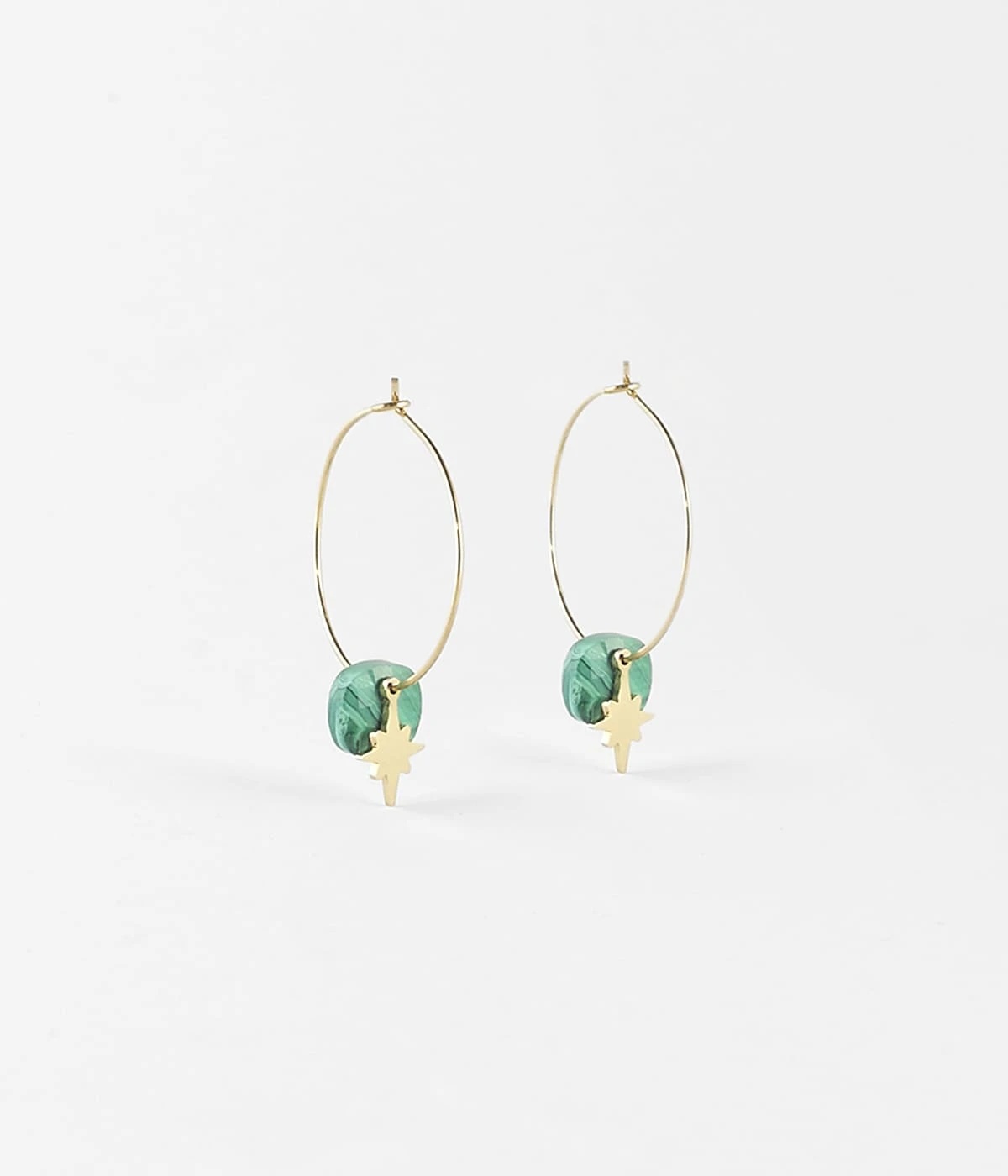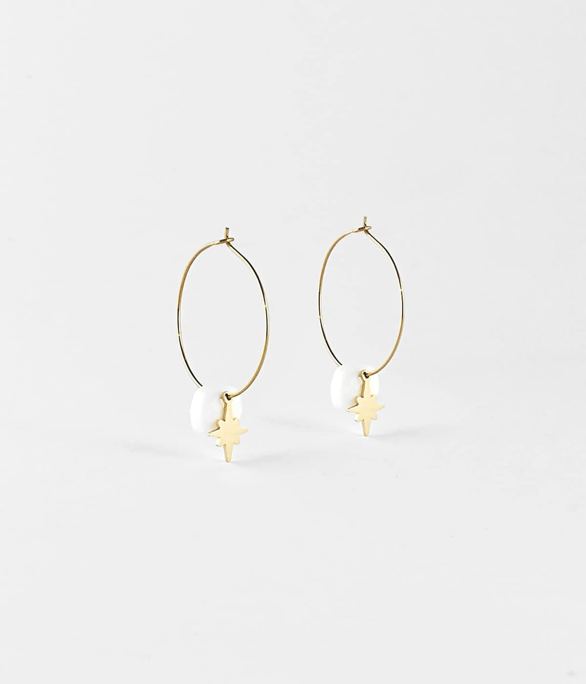 Boucles d’oreilles créoles en acier uni ou doré à l’or fin agrémentées d’une pierre naturelle facettée et d’une pampille de métal en forme d’étoile du Sud.