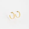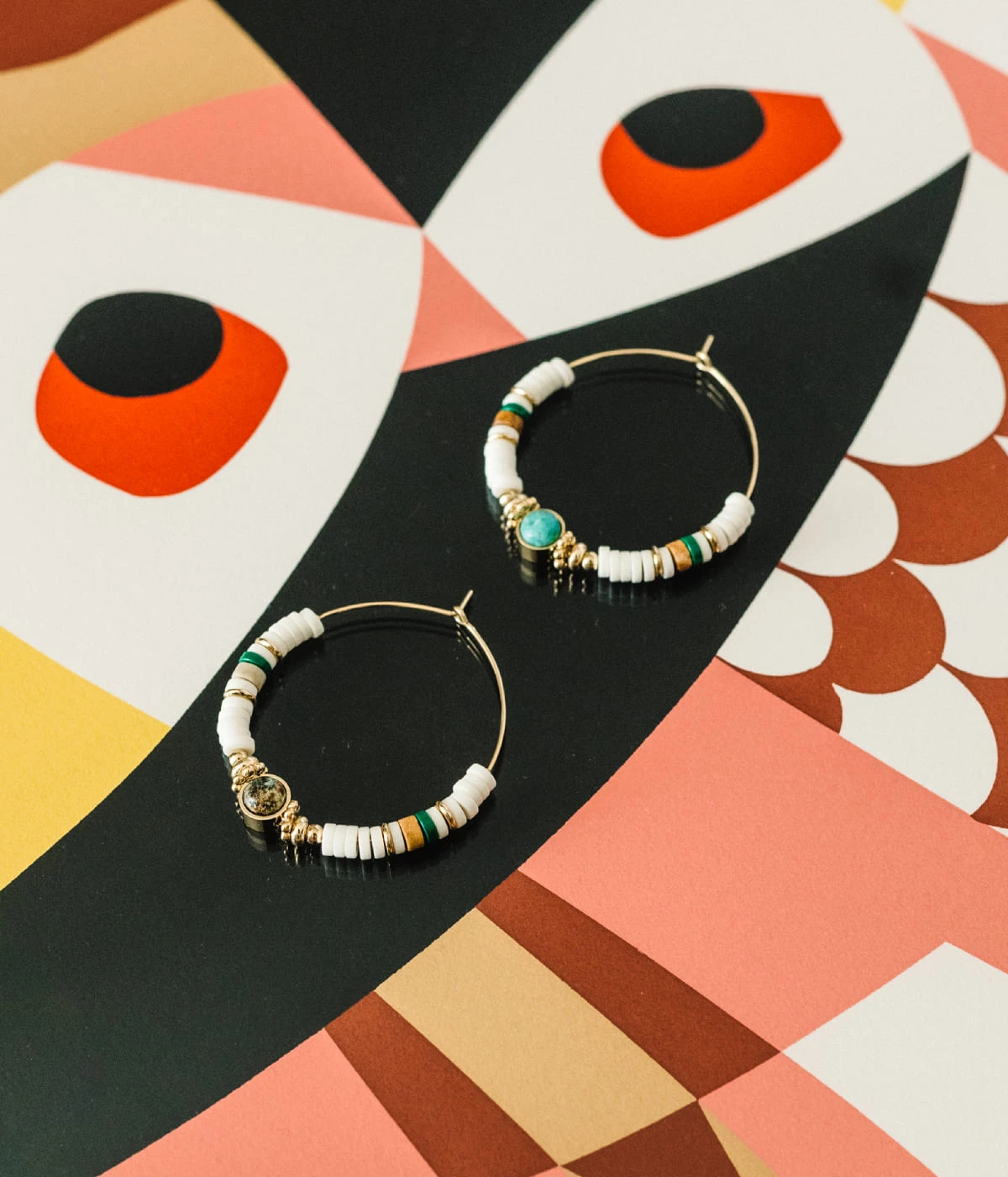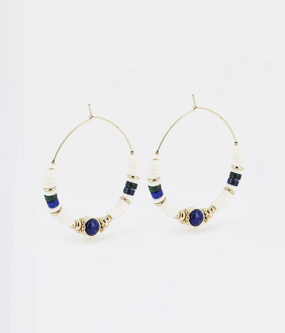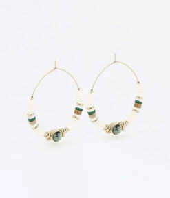 Boucles dâoreilles crĂ©oles en acier dorĂ© Ă lâor fin sur lesquelles sont enfilĂ©es des rondelles de coquillages blancs et de pierres naturelles.
