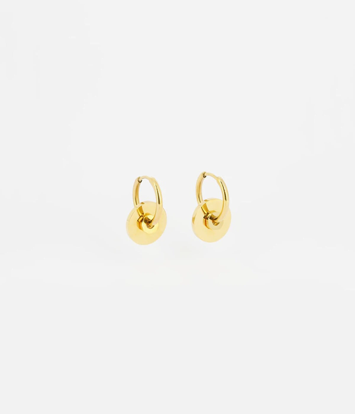Boucles d’oreilles en acier uni ou dorĂ© Ă l’or fin sur lesquelles est suspendue une plaque circulaire.